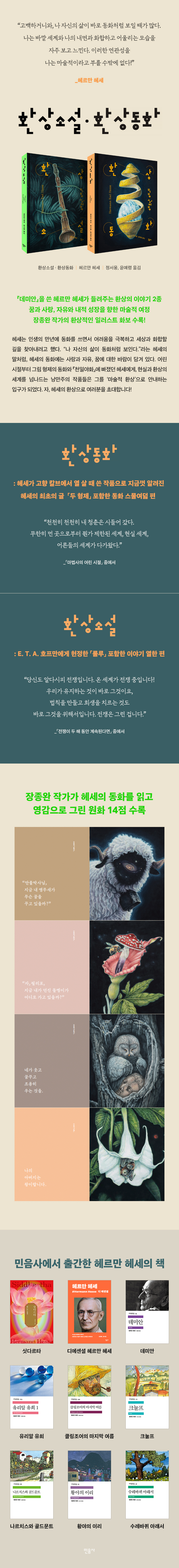 Ç츣¸¸ Çì¼¼°¡ ¾´ ȯ»óÀûÀÎ À̾߱⸦ ¿«Àº ´ÜÆíÁý ¡ºÈ¯»ó¼Ò¼³¡»ÀÌ ¹ÎÀ½»ç¿¡¼ Ãâ°£µÇ¾ú´Ù. ÀÌ Ã¥¿¡´Â Ç츣¸¸ Çì¼¼ÀÇ È¯»óÀûÀÎ ¹®ÇÐ ¼¼°è¸¦ ÇÑÃþ ´õ Æø³Ð°í ±íÀÌ ÀÖ°Ô ¸Àº¼ ¼ö ÀÖ´Â À̾߱⠿ÇÑ ÆíÀÌ ½Ç·Á ÀÖ´Ù. ¾Æ¿ï·¯ ÀÚ¿¬ÀÇ À̹ÌÁö¸¦ ÀÇÀÎÈÇÏ¿© ÃÊÇö½ÇÀûÀΠdz°æ°ú »óȲÀ» ȸÈ, ¼³Ä¡ µîÀ¸·Î ÀÛ¾÷ÈÇÏ´Â ÀåÁ¾¿Ï ÀÛ°¡°¡, Çì¼¼ÀÇ ¡ºÈ¯»ó¼Ò¼³¡»À» ÀÐ°í ¿µ°¨À» ¹Þ¾Æ ÀÛ¾÷ÇÑ ÀÛǰ À̹ÌÁö 7Á¡À» ¼ö·ÏÇÏ¿© Ⱥ¸·Î ±¸¼ºÇÏ¿´´Ù. ¹ÎÀ½»ç´Â 1900³âºÎÅÍ 1951³â±îÁöÀÇ ±â°£¿¡ ¾²ÀÎ, ¡®È¯»óÀûÀÌ°í ³î¶ó¿î »ç°ÇÀ» ½Ã°øÀÇ Á¦¾à ¾øÀÌ ÀÚÀ¯·ÎÀÌ Áö¾î³½ À̾߱⡯¸¦ ¶æÇÏ´Â ¡ºÈ¯»óµ¿È(M?rchen)¡»¿Í º¸´Ù ±íÀº ÅëÂû°ú °æÇèÀ» ´ã°í ÀÖÀ¸¸é¼µµ Àд À̸¦ »ç·ÎÀâ´Â ¸¶·ÂÀº µ¿ÈÀÇ ¸Å·Â¿¡ Áø¹è¾ø´Â ¡ºÈ¯»ó¼Ò¼³(Erz?hlung)¡» 2Á¾À» ÇÔ²² Ãâ°£ÇÏ¿© Çì¼¼°¡ µ¶ÀÚ¿¡°Ô µé·ÁÁÖ°í ½ÍÀº ÁøÁ¤ÇÑ ¡®È¯»ó¡¯ÀÇ ÀǹÌ, Çì¼¼ ƯÀ¯ÀÇ »ç»ó°ú ¹ÌÇаú ÇØÇÐÀ» Àü´ÞÇϰíÀÚ Çß´Ù. Çì¼¼´Â ÀλýÀÇ ¸¸³â¿¡ µ¿È¸¦ ¾²¸é¼ ¾î·Á¿òÀ» ±Øº¹ÇÏ°í ¼¼»ó°ú ÈÇÕÇÒ ±æÀ» ã¾Æ³»·Á°í Çß´Ù. ¡°³ª ÀÚ½ÅÀÇ »îÀÌ µ¿Èó·³ º¸ÀδÙ.¡±¶ó´Â Çì¼¼ÀÇ ¸»Ã³·³, Çì¼¼ÀÇ µ¿È¿¡´Â »ç¶û°ú ÀÚÀ¯, ²Þ¿¡ ´ëÇÑ ¹Ù¶÷ÀÌ ´ã°Ü ÀÖ´Ù. ¾î¸° ½ÃÀýºÎÅÍ ±×¸² ÇüÁ¦ÀÇ µ¿È¿Í ¡ºÃµÀϾßÈ¡»¿¡ ºüÁ³´ø Çì¼¼¿¡°Ô, Çö½Ç°ú ȯ»óÀÇ ¼¼°è¸¦ ³Ñ³ªµå´Â ³¶¸¸ÁÖÀÇ ÀÛǰµéÀº ±×¸¦ ¡®¸¶¼úÀû ȯ»ó¡¯À¸·Î ¾È³»ÇÏ´Â ÀÔ±¸°¡ µÇ¾ú´Ù. 1925³â¿¡ ¾´ ¡¸ÂªÀº À̷¼¡¹¿¡¼ Çì¼¼´Â ÀÌ·¯ÇÑ »ç°íÀÇ Àüȯ¿¡ ´ëÇØ °í¹éÇϰí ÀÖ´Ù.