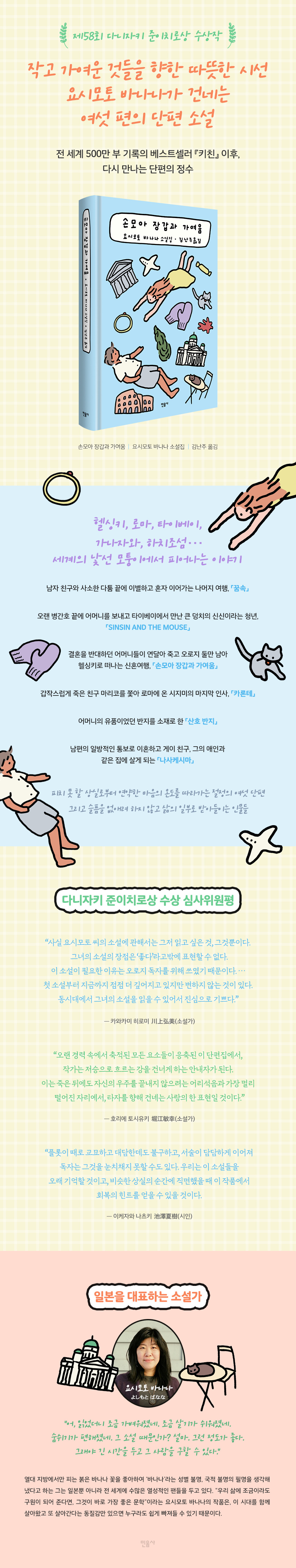 ÀϺ»À» ´ëÇ¥ÇÏ´Â ÀÛ°¡ ¿ä½Ã¸ðÅä ¹Ù³ª³ªÀÇ ¼Ò¼³ÁýÀÌ ¿À·£¸¸¿¡ Ãâ°£µÈ´Ù. ¡ºÅ°Ä£¡», ¡º¾Æ¸£ÇîÆ¼³ª ÇÒ¸Ó´Ï¡», ¡º¸·´Ù¸¥ °ñ¸ñÀÇ Ã߾ µîÀ¸·Î Çѱ¹ µ¶Àڵ鿡°Ôµµ ±íÀº »ç¶ûÀ» ¹Þ¾Æ¿Â ÀÛ°¡°¡ Á¦58ȸ ´Ù´ÏÀÚŰ ÁØÀÌÄ¡·Î»óÀ» ¼ö»óÇÑ ¡º¼Õ¸ð¾Æ Àå°©°ú °¡¿©¿ò¡»À» ÅëÇØ °ÉÀÛ ´ÜÆí ¿©¼¸ ÆíÀ» ¼±º¸ÀδÙ.