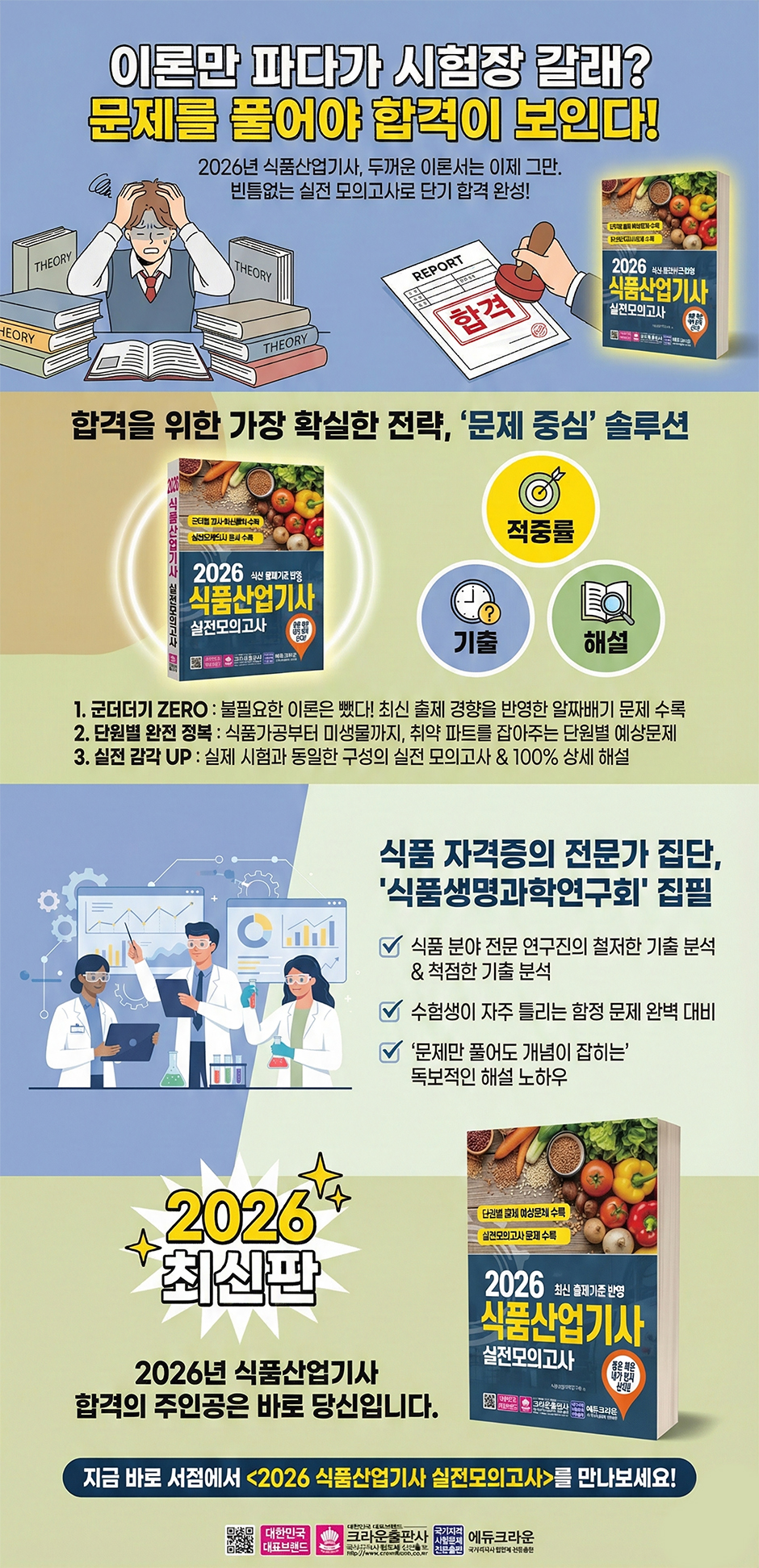 º» µµ¼´Â 2026³â ½Äǰ»ê¾÷±â»ç ÀÚ°ÝÁõ ÃëµæÀ» ¸ñÇ¥·Î ÇÏ´Â ¼öÇè»ýµéÀ» À§ÇØ ±âȹµÇ¾ú½À´Ï´Ù. ¹æ´ëÇÑ ÀÌ·Ð ¾Ï±â¿¡ ÁöÄ£ ¼öÇè»ýµé¿¡°Ô °¡Àå È¿À²ÀûÀÎ ÇнÀ¹ýÀº '¹®Á¦ ÇØ°á ´É·Â'À» Ű¿ì´Â °ÍÀÔ´Ï´Ù. ¡´2026 ½Äǰ»ê¾÷±â»ç ½ÇÀü¸ðÀǰí»ç´Â ÃֽŠÃâÁ¦ °æÇâÀ» ¿Ïº®ÇÏ°Ô ºÐ¼®ÇÏ¿©, ÀÌ·Ð °øºÎ ¾øÀ̵µ ¹®Á¦ Ç®À̸¸À¸·Î ½ÃÇè¿¡ ´ëºñÇÒ ¼ö ÀÖµµ·Ï ±¸¼ºµÈ '½ÇÀü Ưȼ'ÀÔ´Ï´Ù.