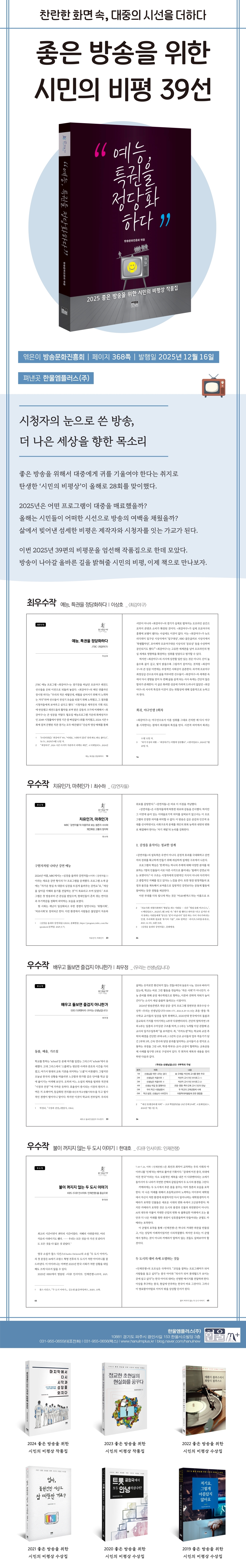 ÁÁÀº ¹æ¼ÛÀ» ¸¸µé±â À§Çؼ ´ëÁßÀÇ ¸ñ¼Ò¸®¿¡ ±Í¸¦ ±â¿ï¿©¾ß ÇÑ´Ù´Â ÃëÁö·Î ź»ýÇÑ ¡®½Ã¹ÎÀÇ ºñÆò»ó¡¯ÀÌ ¿ÃÇØ·Î 28ȸ¸¦ ¸ÂÀÌÇß´Ù. ÀÛǰÀÌ ´øÁö´Â Áú¹®À» ÇÔ²² »ý°¢Çϰí ÁÁÀº ÀÛǰÀ¸·Î ¾È³»ÇÏ´Â ¹æÇâŰÀÎ ¹æ¼Û ºñÆò, À̹ø ¡º¿¹´É, Ư±ÇÀ» Á¤´çÈÇÏ´Ù: 2025 ÁÁÀº ¹æ¼ÛÀ» À§ÇÑ ½Ã¹ÎÀÇ ºñÆò»ó ÀÛǰÁý¡»µµ ±×·¯ÇÑ ºñÆò¹® 39ÆíÀ» ¾ö¼±ÇØ µ¶Àڵ鿡°Ô ¼Ò°³ÇÑ´Ù.