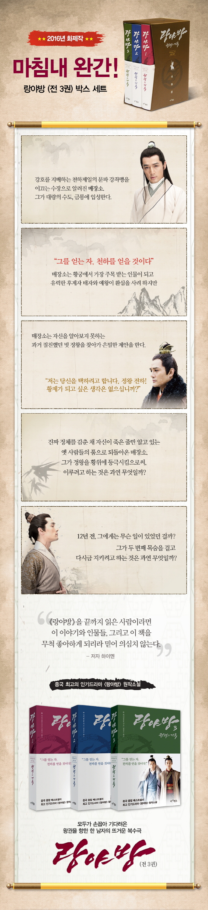 ÇÏÀÌ¿ºÀÇ ¼Ò¼³ ¡º¶û¾ß¹æ¡» Á¦2±Ç. 50°³ µµ½Ã ½Ãû·ü 1À§, ÁßÈTV ¹æ¿µ ÈÄ °³±¹ ÀÌ·¡ ÃÖ°í ½Ãû·üÀ» °»½ÅÇÑ 54ºÎÀÛ µå¶ó¸¶ ¡¶¶û¾ß¹æ¡·ÀÇ ¿øÀÛ¼Ò¼³ÀÌ´Ù. °¡»óÀÇ ¾ç³ª¶ó¸¦ ¹è°æÀ¸·Î, ¿Õ±ÇÀ» µÑ·¯½Ñ Ä¡¿ÇÑ ¾ÏÅõ¿Í º¹¼ö, ¿ìÁ¤°ú »ç¶û, Àΰ£ º»¼ºÀ» ÆÄÇìÄ£ °¡½¿ ÀýÀýÇÑ Á¤Ä¡½Ã´ë±ØÀÌÀÚ ÅëÄèÇÑ º¹¼ö±ØÀÌ´Ù. 2011³â Áß±¹ ¿Â¶óÀÎ ¼Ò¼³ ¿¬Àç »çÀÌÆ®¿¡¼ Å« Àα⸦ ²ö µÚ, µ¶ÀÚµéÀÇ ¿äûÀ¸·Î Ã¥À¸·Î Ãâ°£µÇ¾î ¼Á¡°¡¿¡ µ¹Ç³À» ÀÏÀ¸Ä×´Ù.