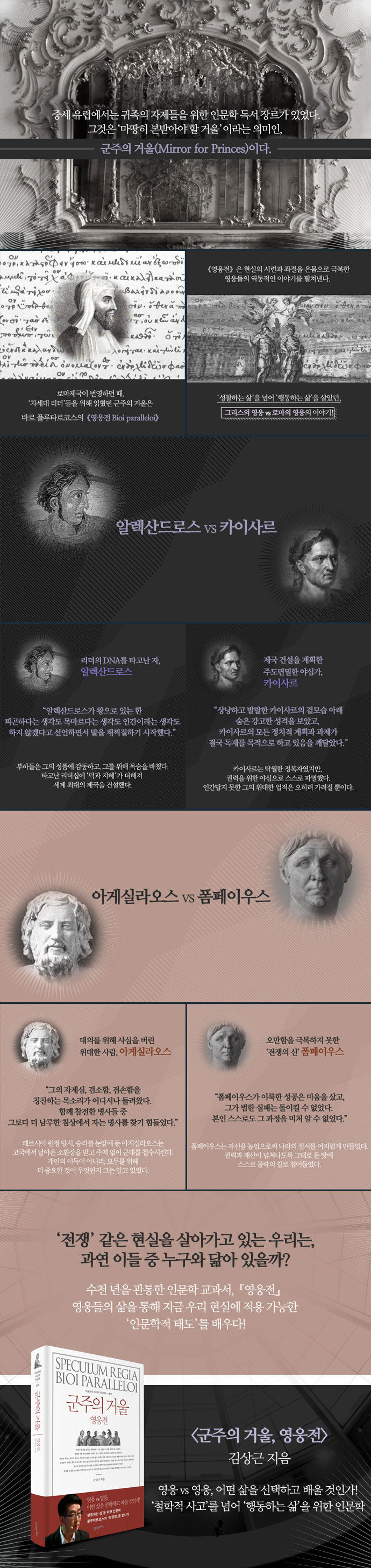 Áß¼¼ À¯·´ÀεéÀº ÀåÂ÷ ±ºÁÖ·Î ¾ç¼ºÇÒ Â÷¼¼´ë ¸®´õ¸¦ À§ÇÑ Àι®ÇÐ µ¶¼ À帣¸¦ ¡®±ºÁÖÀÇ °Å¿ï¡¯À̶ó ºÒ·¶´Ù. ±ºÁÖÀÇ °Å¿ï Áß¿¡¼µµ ±³°ú¼ÀûÀÎ ÀÛǰÀÎ Ç÷矸£ÄÚ½ºÀÇ ¡º¿µ¿õÀüBioi paralleloi¡»Àº ·Î¸¶ Á¦±¹ ¹ø¿µÀ» À§ÇÑ Çʵ¶¼ÀÌÀÚ, ÀÌÈÄ ¼öõ ³â µ¿¾È Àηù¿¡°Ô ÀÐÇô¿Â À§´ëÇÑ °íÀüÀÌ´Ù. ¿©·¯ °¿¬°ú Àú¼¸¦ ÅëÇØ µ¶Àڵ鿡°Ô Àι®ÇÐÀû ¿µ°¨°ú °¨µ¿À» ºÒ·¯ÀÏÀ¸Äѿ ¿¬¼¼´ë ±è»ó±Ù ±³¼ö´Â, ¡º±ºÁÖÀÇ °Å¿ï, ¿µ¿õÀü¡»¿¡¼ Çö½Ç¿¡ Àû¿ë °¡´ÉÇÑ Àι®ÇÐÀÇ È¿¿ë°ú °¡Ä¡¸¦ »ý»ýÈ÷ ±×·Á³½´Ù.