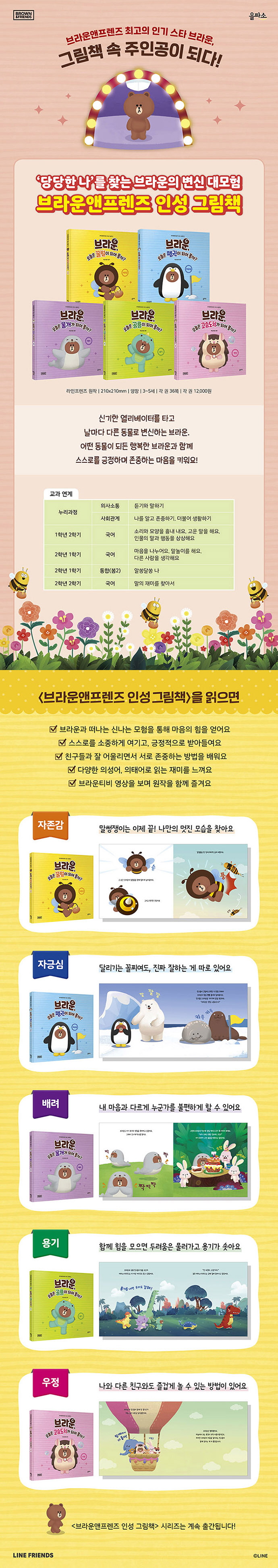 ±Û·Î¹ú Å©¸®¿¡ÀÌÆ¼ºê ½ºÆ©µð¿À ¡®¶óÀÎÇÁ·»Áî(LINE FRIENDS)¡¯ÀÇ ¿À¸®Áö³Î ij¸¯ÅÍ ¡®ºê¶ó¿î¾ØÇÁ·»ÁÀÇ Àα⠽ºÅ¸ ºê¶ó¿îÀÌ µîÀåÇϴ ù Àμº ±×¸²Ã¥ ¡´ºê¶ó¿î¾ØÇÁ·»Áî Àμº ±×¸²Ã¥¡µ ½Ã¸®Áî°¡ À»ÆÄ¼Ò¿¡¼ Ãâ°£µÇ¾ú½À´Ï´Ù. ¡´ºê¶ó¿î¾ØÇÁ·»Áî Àμº ±×¸²Ã¥¡µÀº ºê¶ó¿îÀÌ ½£¿¡¼ ¿ì¿¬È÷ ¹ß°ßÇÑ ¸¶¹ýÀÇ ¿¤¸®º£ÀÌÅ͸¦ Ÿ°í ´Ù¾çÇÑ µ¿¹°·Î º¯½ÅÇÏ¸ç °Þ´Â ¸ðÇèÀ» ´ã°í ÀÖ½À´Ï´Ù. À̹ø¿¡ ¹ß°£µÈ ½Ã¸®Áî 5±ÇÀº ½Å³ª´Â ¸ðÇè À̾߱âÀÎ µ¿½Ã¿¡ ºê¶ó¿îÀÌ ÁÖº¯ µ¿¹°µé°ú ÁÂÃæ¿ìµ¹ÇÏ´Â °úÁ¤À» ÅëÇØ ¾ÆÀ̵éÀÇ °Ç°ÇÑ ÀÚ¾Æ Çü¼ºÀ» µ½´Â ¸¶À½ ¼ºÀå ±×¸²Ã¥À̱⵵ ÇÕ´Ï´Ù. °¢ ±ÇÀº ¶Ç·¡ Áý´ÜÀ¸·Î ÀÌ·ç¾îÁø ÀÛÀº »çȸ¿¡ ù ¹ßÀ» µðµò ¾ÆÀ̵鿡°Ô ²À ÇÊ¿äÇÑ ÀÚÁ¸°¨, ÀÚ±à½É, ¹è·Á, ¿ë±â, ¿ìÁ¤À̶ó´Â ÁÖÁ¦¸¦ ´Ù·ç°í ÀÖ½À´Ï´Ù.