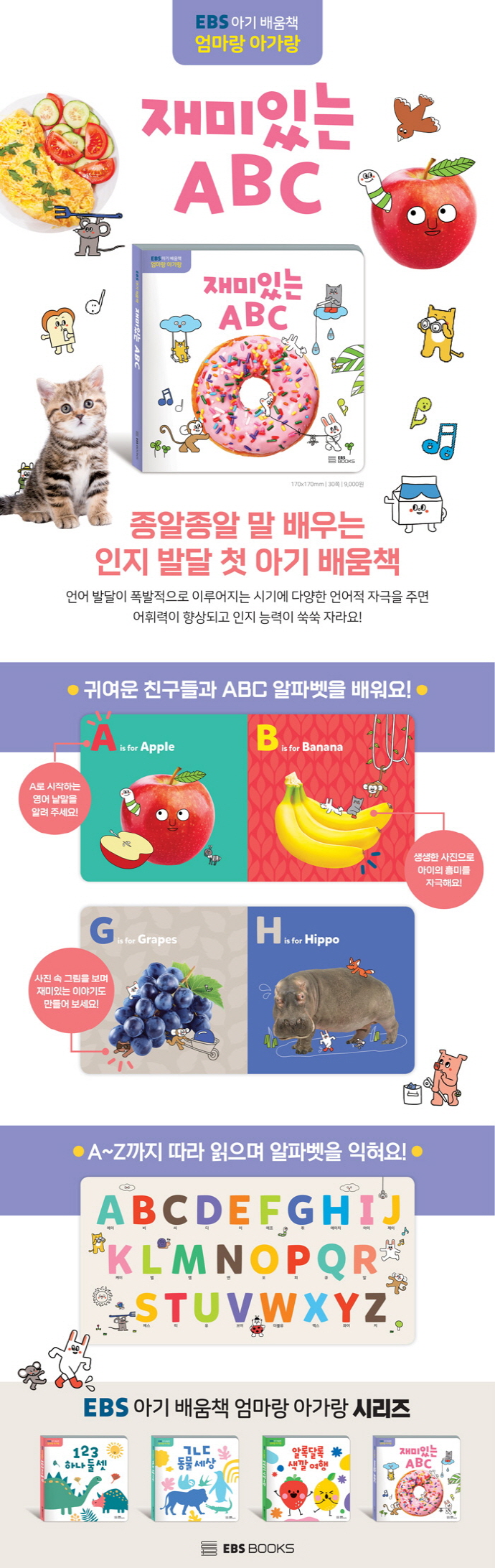 ¡´Àç¹ÌÀÖ´Â ABC¡µ´Â ¾ËÆÄºªÀ» ½±°í Àç¹ÌÀÖ°Ô ÀÍÈú ¼ö ÀÖ´Â ±×¸²Ã¥ÀÌ¿¡¿ä. »ç°ú, ¹Ù³ª³ª, °í¾çÀÌ, µµ³Ó µî A~Z·Î ½ÃÀÛÇÏ´Â ¿µ¾î ³¹¸»À» »ý»ýÇÑ »çÁø°ú ÇÔ²² ±¸¼ºÇß¾î¿ä. ¶ÇÇÑ »çÁø°ú ¾î¿ï¸®´Â ±Í¿©¿î µ¿¹° Ä£±¸µéÀ» ±×¸²À¸·Î ±×·Á º¸´Â Àç¹Ì¸¦ ´õÇß½À´Ï´Ù. ¾ËÆÄºª°ú ¿µ¾î ³¹¸»À» µû¶ó ÀÐÀ¸¸ç »ý¾Ö ù ¾ËÆÄºªÀ» ½ÃÀÛÇϼ¼¿ä!