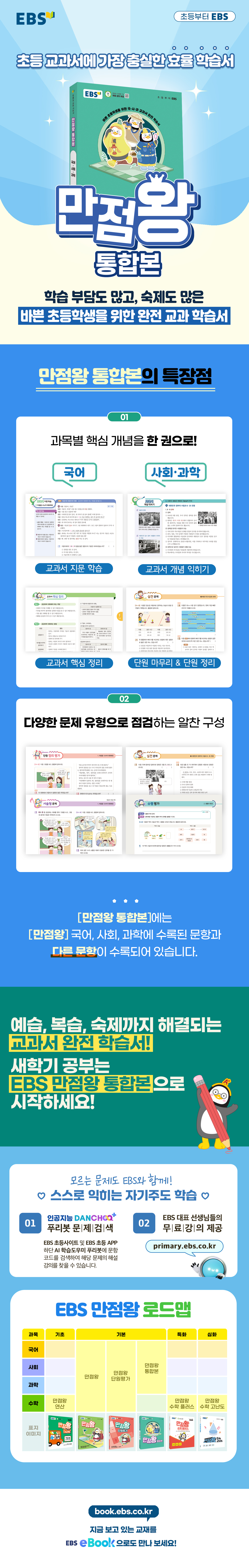 - ¡º¸¸Á¡¿Õ ÅëÇÕº»¡»Àº ±¹¾î, »çȸ, °úÇÐ ±³°ú¼ ÇÙ½É ³»¿ëÀ» ¾ÐÃàÀûÀ¸·Î Á¤¸®ÇÏ¿© ÇнÀ ºÎ´ã°ú ¼÷Á¦ ºÎ´ãÀÌ ¸¹Àº ÃʵîÇлýµµ ºü¸£°Ô ¸¸Á¡¿Õ ÇнÀÀÌ °¡´ÉÇÒ ¼ö ÀÖµµ·Ï ±¸¼ºÇÏ¿´½À´Ï´Ù.