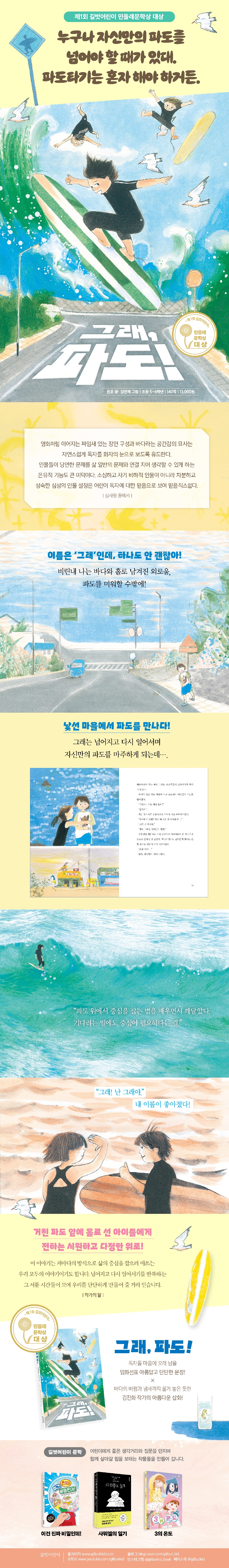 Á¦1ȸ ±æ¹þ¾î¸°ÀÌ ¹Îµé·¹¹®Çлó ´ë»ó ¼ö»óÀÛ ¡¶±×·¡, ÆÄµµ!¡·´Â ÁÖÀΰø ±×·¡°¡ ¿ìÁ¤°ú ¼ÇÎÀ» ÅëÇØ ÀڽŸ¸ÀÇ ÆÄµµ¸¦ Ÿ°í, ¼ºÀåÇÏ´Â À̾߱â´Ù. ±×·¡ °¡Á·Àº ¼¿ï¿¡¼ ¹Ù´å°¡ ¸¶À»·Î À̻縦 ¿Â´Ù. ÇÏÁö¸¸ ¾ö¸¶°¡ ÆÄµµ ¼Ò¸® ¶§¹®¿¡ ÀáÀ» ¸ø ÀÚ°Ú´Ù¸ç º´À» ¾ò°í, ²ÞÀ» ã¾Æ ¼¿ï·Î ´Ù½Ã ¶°³´Ù. ÀÌ·¸°Ô µÈ ÀÌ»ó, ÆÄµµ¸¦ ¹Ì¿öÇÒ ¼ö¹Û¿¡! ¹Ù´ÙÀÇ ºñ¸°³»µµ ½ÈÀº Ƽ¸¦ ¸ø ³»°í, ºÒ²É³îÀÌ ´ë½Å ºÁ¾ß ÇÏ´Â ±Â ³îÀ̵µ ³Ê¹« ½ÈÁö¸¸, ±×·¡´Â ¹Ù´Ù¿¡ ¹°¼öÁ¦ºñ¸¦ ¶ß¸ç ¸¶À½À» Åö, Åö, ´øÁ® º¸´Â °Í ¿Ü¿¡ ÇÒ ¼ö ÀÖ´Â °Ô ¾ø´Ù. ÇÏÁö¸¸ ±×·¡´Â ¼ÇÎ °í¼ö ¼ö¾Æ¿¡°Ô ¡®Çª¸¥ ¹Ù´Ù µ¹°í·¡ Àººû ¼ö¾Æ¡¯¶ó´Â ±ä À̸§À» ºÙ¿© ÁÖ°í, Á¡Á¡ ¼ö¾Æ¿Í ¼ÇÎÀÇ ¸Å·Â¿¡ ºüÁ® µç´Ù. ¼ÇÎÀ» ¹è¿ì¸é¼ ¾ö¸¶¸¦ Æ÷ÇÔÇØ ´©±¸³ª ÀڽŸ¸ÀÇ ÆÄµµ¸¦ Ÿ°í ÀÖ´Ù´Â °Í, º¸³» ÁÖ¾î¾ß ÇÒ ÆÄµµ¿Í Ÿ°í ³ÑÀ» ÆÄµµ¸¦ ±¸ºÐÇϸç Áß½ÉÀ» Àâ°í ±â´Ù¸®´Â ¹ýÀ» ±ú´Þ¾Æ °£´Ù. ±×¸®°í ¹«¼·±â¸¸ Çß´ø ÆÄµµ¿¡°Ô ¡®À¯ÄèÇÑ ÆÄµµ ¾¾¡¯¶ó´Â º°¸íÀ» Áö¾î ÁÙ ¸¸Å ¼ºÀåÇÑ´Ù.
