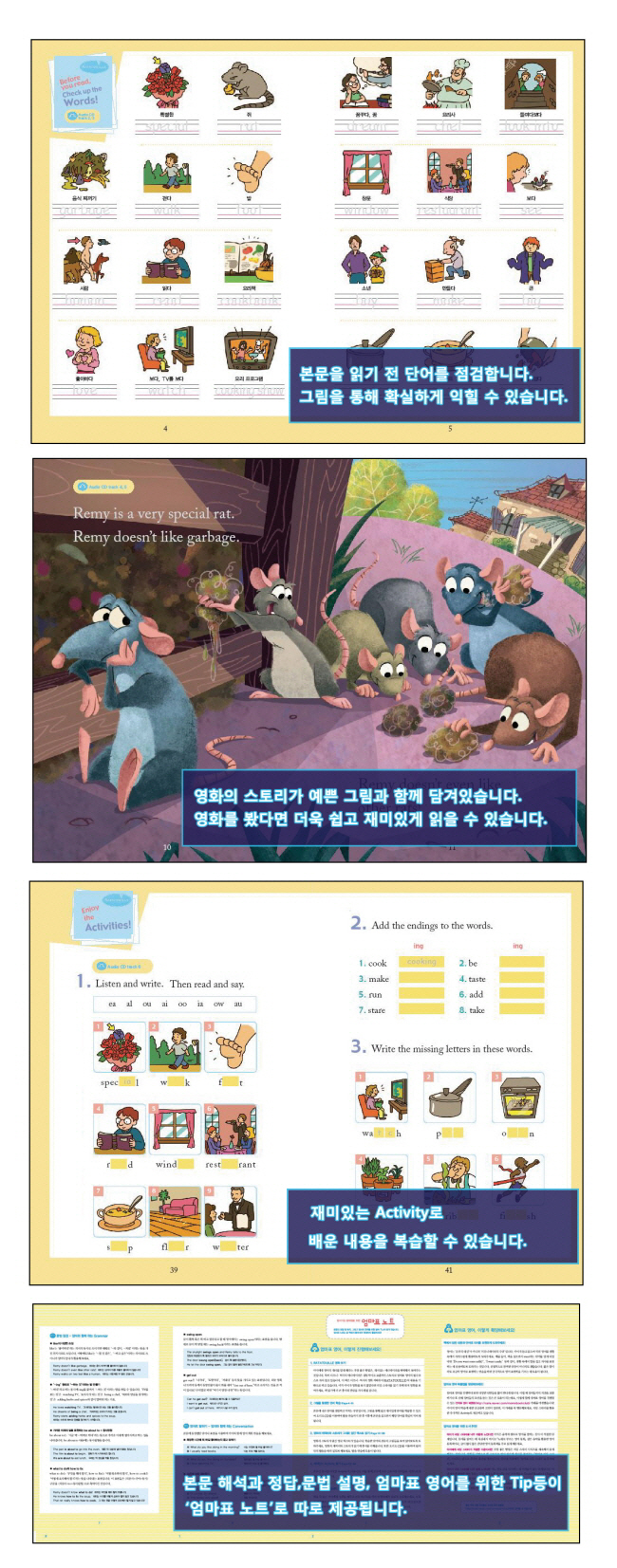 ÀÌ Ã¥Àº ¾ÆÀ̵éÀÌ ÁÁ¾ÆÇÏ´Â ÇÈ»ç ¾Ö´Ï¸ÞÀÌ¼Ç Ratatouille(¶óµû¶ÑÀÌ)ÀÇ ³»¿ëÀ» ¹ÙÅÁÀ¸·Î ÇÑ ¿µ¾î µ¿ÈÃ¥ÀÔ´Ï´Ù. ¶óµû¶ÑÀÌÀÇ ¡´ The Big Cheese¡µ°¡ ·¹¹ÌÀÇ ¿©ÇàÀ» ÀüüÀûÀ¸·Î ´Ù·ç°í ÀÖ´Ù¸é, ¡´ Run, Remy, Run¡µÀº ·¹¹Ì°¡ ¸µ±Í´Ï¸¦ µ½´Â À̾߱⿡ ÃÊÁ¡ÀÌ ¸ÂÃçÁ® ÀÖ½À´Ï´Ù. ¿µÈ ¼Ó ij¸¯ÅͰ¡ ±×´ë·Î µîÀåÇØ ¿µ¾î¿¡ °ü½ÉÀ» À¯µµÇϰí, ¿µ¾î¸¦ óÀ½ ½ÃÀÛÇÏ´Â ¾î¸° ¾ÆÀ̵鵵 ºÎ´ã ¾øÀÌ ¸®µùÀ» ½ÃÀÛÇÒ ¼ö ÀÖµµ·Ï µµ¿ÍÁÝ´Ï´Ù.