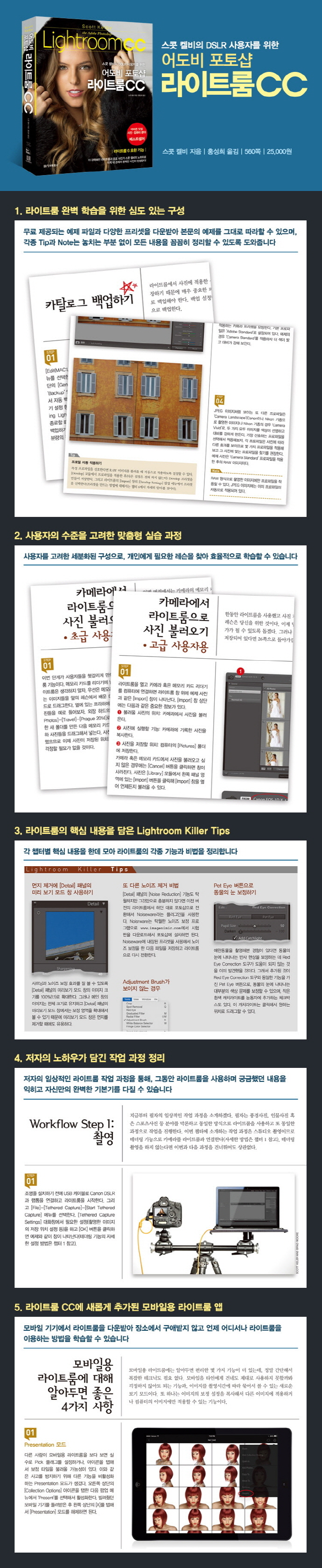 Ã¥¼Ò°³¡º½ºÄà Ä̺ñÀÇ DSLR »ç¿ëÀÚ¸¦ À§ÇÑ ¾îµµºñ Æ÷Åä¼¥ ¶óÀÌÆ®·ë CC¡»´Â ¶óÀÌÆ®·ë »ç¿ëÀÚµéÀ» À§ÇÑ Ã¥ÀÌ´Ù. ¡®The Lightroom Show¡¯¿Í ¼¼¹Ì³ª¸¦ ÁøÇàÇÏ¸ç »ç¿ëÀÚµéÀÌ ¹«¾ùÀ» ¾î·Á¿öÇÏ´ÂÁö, ¶Ç ¹«¾ùÀ» ±Ã±ÝÇØ ÇÏ´ÂÁö ¿Ïº®È÷ ÆÄ¾ÇÇÑ ÀúÀÚ´Â ´Ü¼øÈ÷ ½½¶óÀÌ´õÀÇ ±â´É¸¸ ¼³¸íÇÏ´Â ´ë½Å, Á÷Á¢ °æÇèÀ» ÅëÇØ Å͵æÇÑ ¼³Á¤°ú Å×Å©´Ð, ÀÛ¾÷ °úÁ¤À» ³ëÇϿ츦 ³¹³¹ÀÌ °ø°³ÇÑ´Ù.