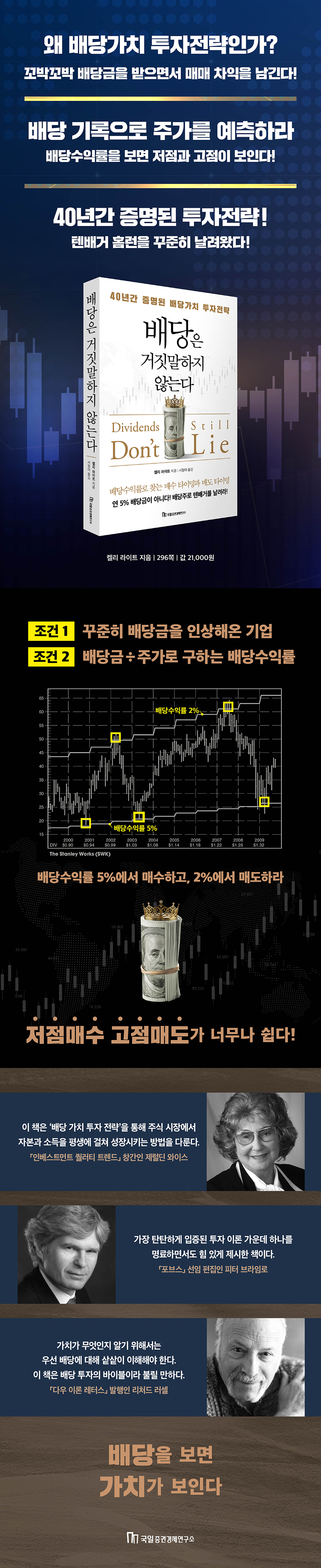 ÀÌ Ã¥Àº ¹è´çÀ̶ó´Â °¡Àå ´Ü´ÜÇÑ ±âÁØÀ¸·Î ÁÖ½Ä ½ÃÀåÀ» Àд ¹æ¹ýÀ» Á¦½ÃÇÑ´Ù. °æ¿µ »óȲ, ½ÃÀå »óȲ µîÀ» °¡´ÆÇØ ÁÖ°¡°¡ ¿À¸¦Áö ³»¸±Áö ¸ÂÈ÷´Â ºÒÈ®½ÇÇÑ ÅõÀÚ ¹æ¹ý ´ë½Å, ¹è´ç¼öÀÍ·üÀ̶ó´Â °´°üÀû ÁöÇ¥¸¦ ÅëÇØ ÀúÆò°¡ ¹× °íÆò°¡ ±¸°£À» ¼³Á¤ÇÏ°í ±× ¾È¿¡¼ ¸Å¼ö¤ý¸Åµµ ¿øÄ¢À» ¼¼¿î´Ù. °¨(Êï)ÀÌ ¾Æ´Ï¶ó ±âÁØÀ¸·Î ÆÇ´ÜÇϰí, ´Ü±â º¯µ¿ÀÌ ¾Æ´Ï¶ó Àå±â »çÀÌŬ¿¡ ±Ù°ÅÇØ ÅõÀÚ °áÁ¤À» ³»¸®°Ô ¸¸µå´Â Ã¥ÀÌ´Ù.