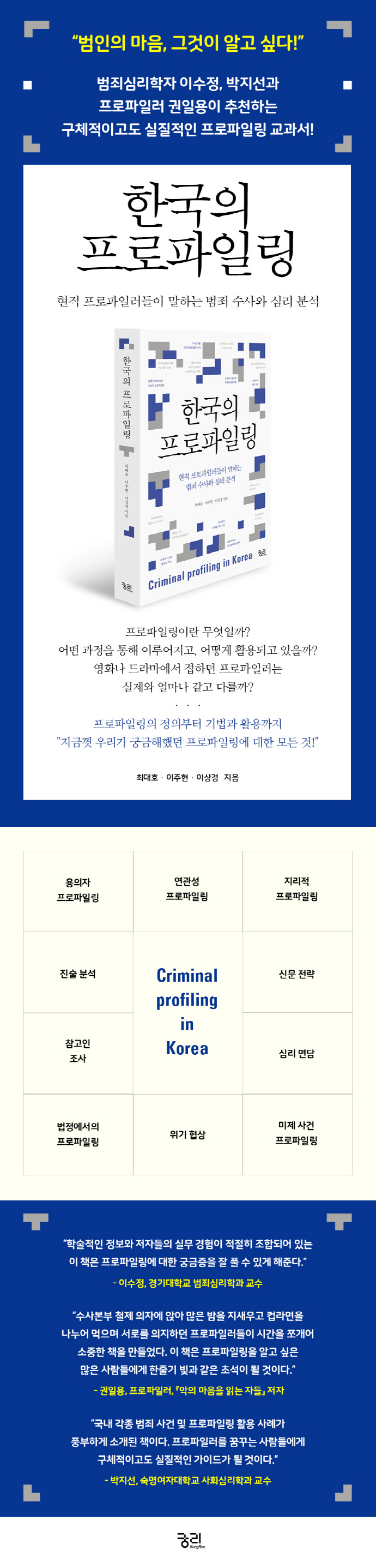 ¹Ì±¹À̳ª ¿µ±¹Ã³·³ ¿ì¸®³ª¶ó¿¡µµ ÇÁ·ÎÆÄÀϸµÀ̶ó´Â »õ·Î¿î ¼ö»ç ±â¹ýÀ» µµÀÔÇÏ¿© ¹üÁ˺м®ÆÀÀ» Á¦µµÈÇØ¾ß ÇÑ´Ù´Â À̾߱Ⱑ ³ª¿Ô´ø ½ÃÀýÀº À¯¿µÃ¶ ¿¬¼â»ìÀλç°Ç(2003~2004³â)ÀÌ ¹ß»ýÇÑ Á÷ÈÄ¿´´Ù. 2000³â´ë Ãʹݸ¸ ÇÏ´õ¶óµµ ¿¬¼â»ìÀÎÀ̶ó´Â °ÍÀÌ ¿Ö ¹ß»ýÇÏ´ÂÁö, ¿¬¼â»ìÀιüÀÇ Á¤Ã¼´Â ¹«¾ùÀÎÁö Á¦´ë·Î ¾ËÁö ¸øÇß´Ù. ±× °í¹ÎÀÇ ³¡¿¡ ź»ýÇÏ°Ô µÈ °ÍÀÌ ÀÌ Ã¥ ¡ºÇѱ¹ÀÇ ÇÁ·ÎÆÄÀϸµ¡»ÀÇ ¼¼ ÀúÀÚ ÃÖ´ëÈ£, ÀÌÁÖÇö, ÀÌ»ó°æ ÇÁ·ÎÆÄÀÏ·¯(¹üÁ˺м®¿ä¿ø)°¡ ¼ÓÇØ ÀÖ´Â Çѱ¹ÀÇ ÇÁ·ÎÆÄÀϸµÆÀÀÌ´Ù.