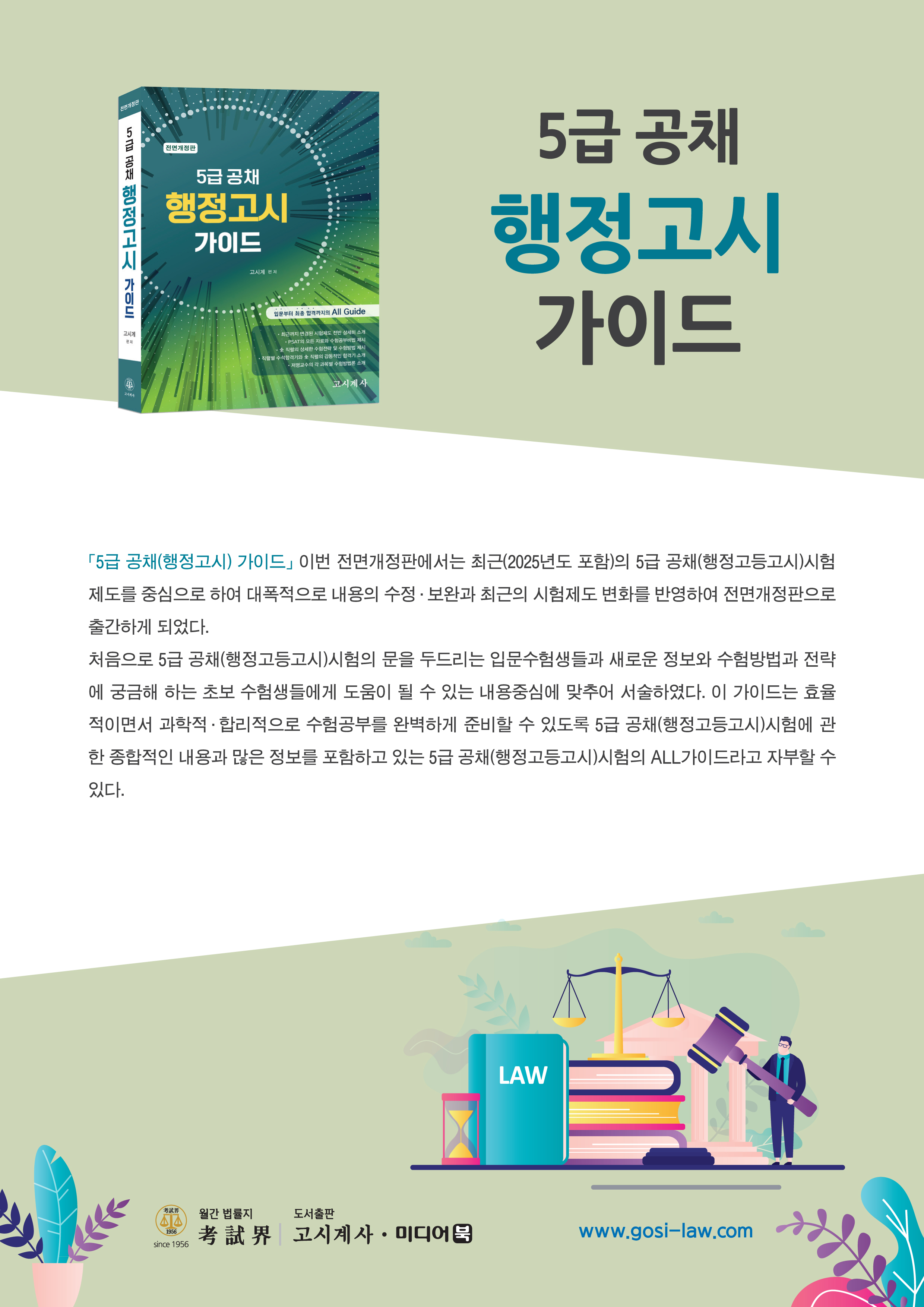 óÀ½À¸·Î 5±Þ °øÃ¤(ÇàÁ¤°íµî°í½Ã)½ÃÇèÀÇ ¹®À» µÎµå¸®´Â ÀÔ¹®¼öÇè»ýµé°ú »õ·Î¿î Á¤º¸¿Í ¼öÇè¹æ¹ý°ú Àü·«¿¡ ±Ã±ÝÇØ ÇÏ´Â Ãʺ¸ ¼öÇè»ýµé¿¡°Ô µµ¿òÀÌ µÉ ¼ö ÀÖ´Â ³»¿ëÁ߽ɿ¡ ¸ÂÃß¾î ¼¼úÇÏ¿´´Ù. ÀÌ °¡À̵å´Â È¿À²ÀûÀÌ¸é¼ °úÇÐÀû¡¤ÇÕ¸®ÀûÀ¸·Î ¼öÇè°øºÎ¸¦ ¿Ïº®ÇÏ°Ô ÁغñÇÒ ¼ö ÀÖµµ·Ï 5±Þ °øÃ¤(ÇàÁ¤°íµî°í½Ã)½ÃÇè¿¡ °üÇÑ Á¾ÇÕÀûÀÎ ³»¿ë°ú ¸¹Àº Á¤º¸¸¦ Æ÷ÇÔÇϰí ÀÖ´Â 5±Þ °øÃ¤(ÇàÁ¤°íµî°í½Ã)½ÃÇèÀÇ ALL°¡À̵å¶ó°í ÀÚºÎÇÒ ¼ö ÀÖ´Ù.