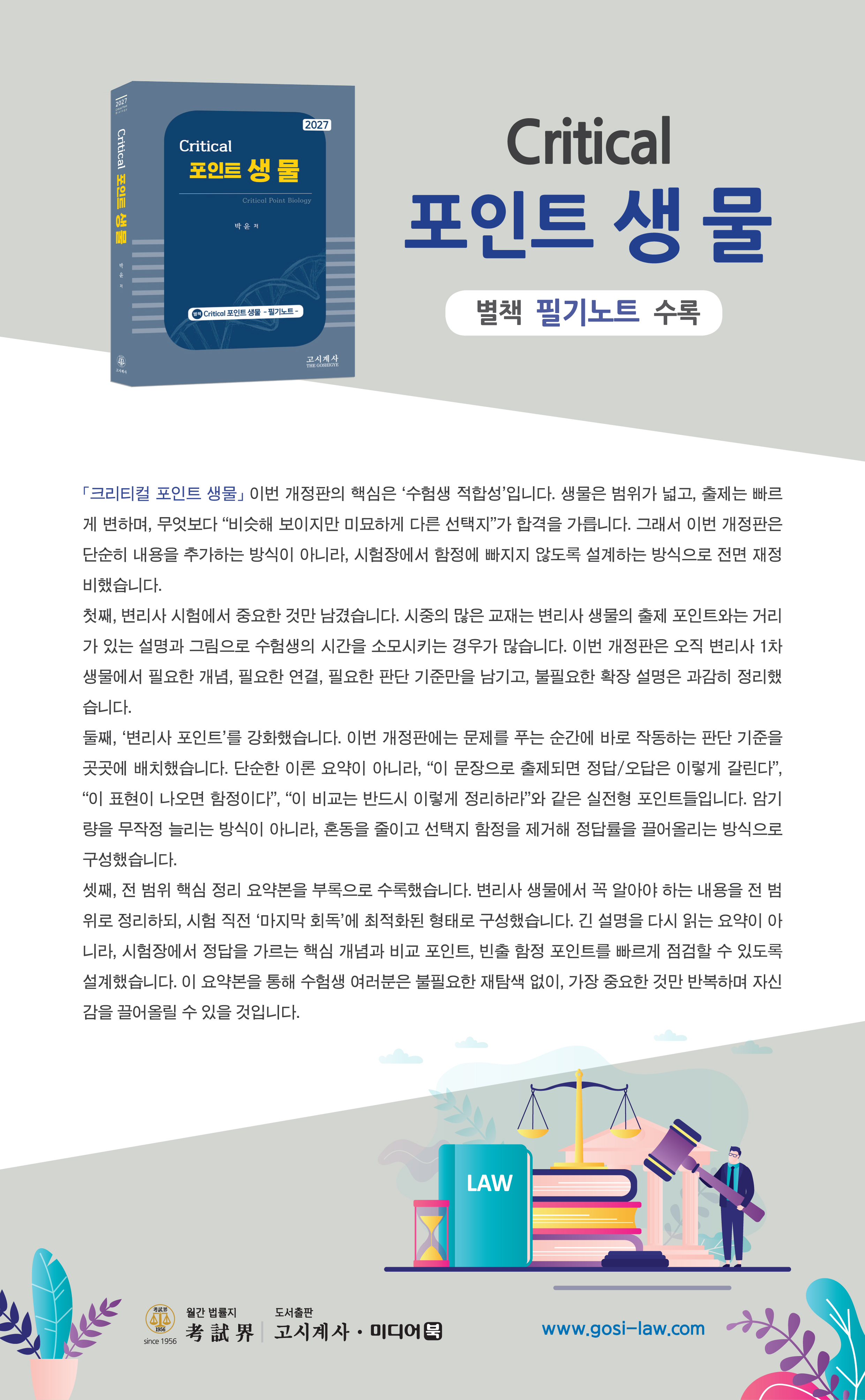 ¼Â°, Àü ¹üÀ§ ÇÙ½É Á¤¸® ¿ä¾àº»À» ºÎ·ÏÀ¸·Î ¼ö·ÏÇß½À´Ï´Ù. º¯¸®»ç »ý¹°¿¡¼ ²À ¾Ë¾Æ¾ß ÇÏ´Â ³»¿ëÀ» Àü ¹üÀ§·Î Á¤¸®ÇϵÇ, ½ÃÇè Á÷Àü ¡®¸¶Áö¸· ȸµ¶¡¯¿¡ ÃÖÀûÈµÈ ÇüÅ·Π±¸¼ºÇß½À´Ï´Ù. ±ä ¼³¸íÀ» ´Ù½Ã Àд ¿ä¾àÀÌ ¾Æ´Ï¶ó, ½ÃÇèÀå¿¡¼ Á¤´äÀ» °¡¸£´Â ÇÙ½É °³³ä°ú ºñ±³ Æ÷ÀÎÆ®, ºóÃâ ÇÔÁ¤ Æ÷ÀÎÆ®¸¦ ºü¸£°Ô Á¡°ËÇÒ ¼ö ÀÖµµ·Ï ¼³°èÇß½À´Ï´Ù. ÀÌ ¿ä¾àº»À» ÅëÇØ ¼öÇè»ý ¿©·¯ºÐÀº ºÒÇÊ¿äÇÑ À玻ö ¾øÀÌ, °¡Àå Áß¿äÇÑ °Í¸¸ ¹Ýº¹Çϸç ÀڽۨÀ» ²ø¾î¿Ã¸± ¼ö ÀÖÀ» °ÍÀÔ´Ï´Ù.