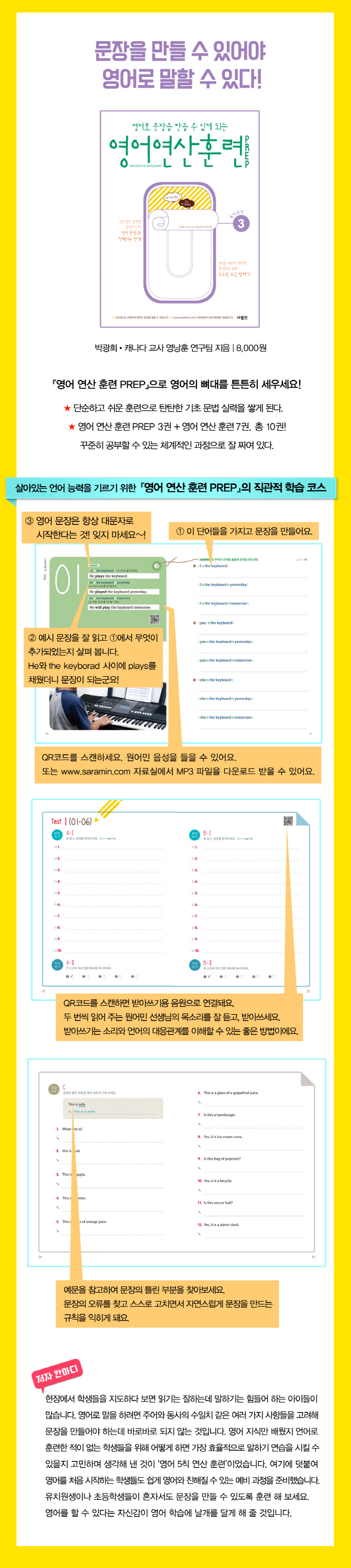 ¡º¿µ¾î ¿¬»ê ÈÆ·Ã PREP 3¡»¿¡¼´Â ÇʼöÀûÀ¸·Î ¾Ë¾ÆµÎ¾î¾ß ÇÏ´Â play, make, walk, run, go, watch µîÀÇ µ¿»çµéÀ» ÇöÀç ½ÃÁ¦¿Í °ú°Å, ±×¸®°í ¹Ì·¡ ½ÃÁ¦·Î Ç¥ÇöÇÏ´Â ¹æ¹ýÀ» ´Ù¾çÇÏ°Ô ÀÍÈú ¼ö ÀÖ´Ù. ÀÌ Ã¥¿¡ Á¦½ÃµÈ ¹®ÀåÀ» ¾²°í ¸»ÇÏ´Ù º¸¸é ¾î´À»õ ¸Ó¸´¼Ó¿¡ ¿µ¾îÀÇ »À´ë°¡ ½×¿© ¿µ¾î·Î ¹®ÀåÀ» ¼ú¼ú ¸¸µé ¼ö ÀÖ°Ô µÈ´Ù. |