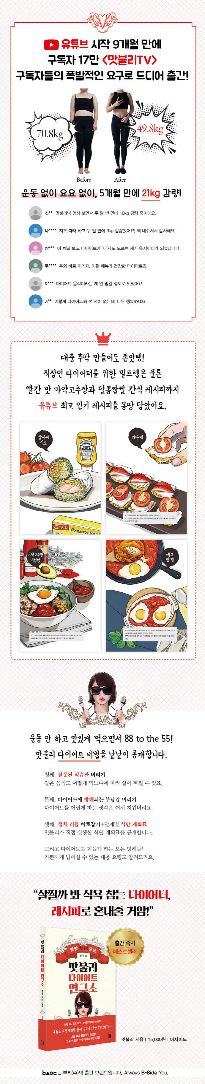 ¸ðÅ ³¯¾ÀÀÌ ¾Æ´Ï¶ó¼ »ìÀÌ ºüÁö´Â ¿ø¸®¸¦ öÀúÈ÷ °øºÎÇß°í, ±Ý¼ÕÀÌ ¾Æ´Ï¶ó¼ ÃÖ´ëÇÑ °£´ÜÇÏ°Ô ´ÙÀÌ¾îÆ® ¿ä¸®¸¦ ¸¸µé¾ú´ø ÀúÀÚ´Â ±×·¯¸é¼ 21kgÀ» »©°í À¯ÁöÇÏ´Â °úÁ¤À» À¯Æ©ºê¿¡ °ø°³Çϸç Å« Àαâ¿Í °ø°¨À» ¾ò¾ú´Ù. ´ÙÀÌ¾îÆ® ½ÇÆÐ¿¡ ÁöÄ£ »ç¶÷, º¹ÀâÇÑ ¿ä¸®µµ ¼³°ÅÁöµµ ±ÍÂúÀº »ç¶÷, ¿îµ¿Çϱ⠽ÈÀº »ç¶÷±îÁö ¸ðµÎ Æ÷¿ëÇÏ´Â ´ÙÀÌ¾îÆ®, 17¸¸ ±¸µ¶ÀÚ°¡ ¿±¤ÇÏ´Â ¸ÀºÒ¸® ´ÙÀÌ¾îÆ®ÀÇ ¸ðµç °ÍÀ» ¸¸³ªº¼ ¼ö ÀÖ´Ù.