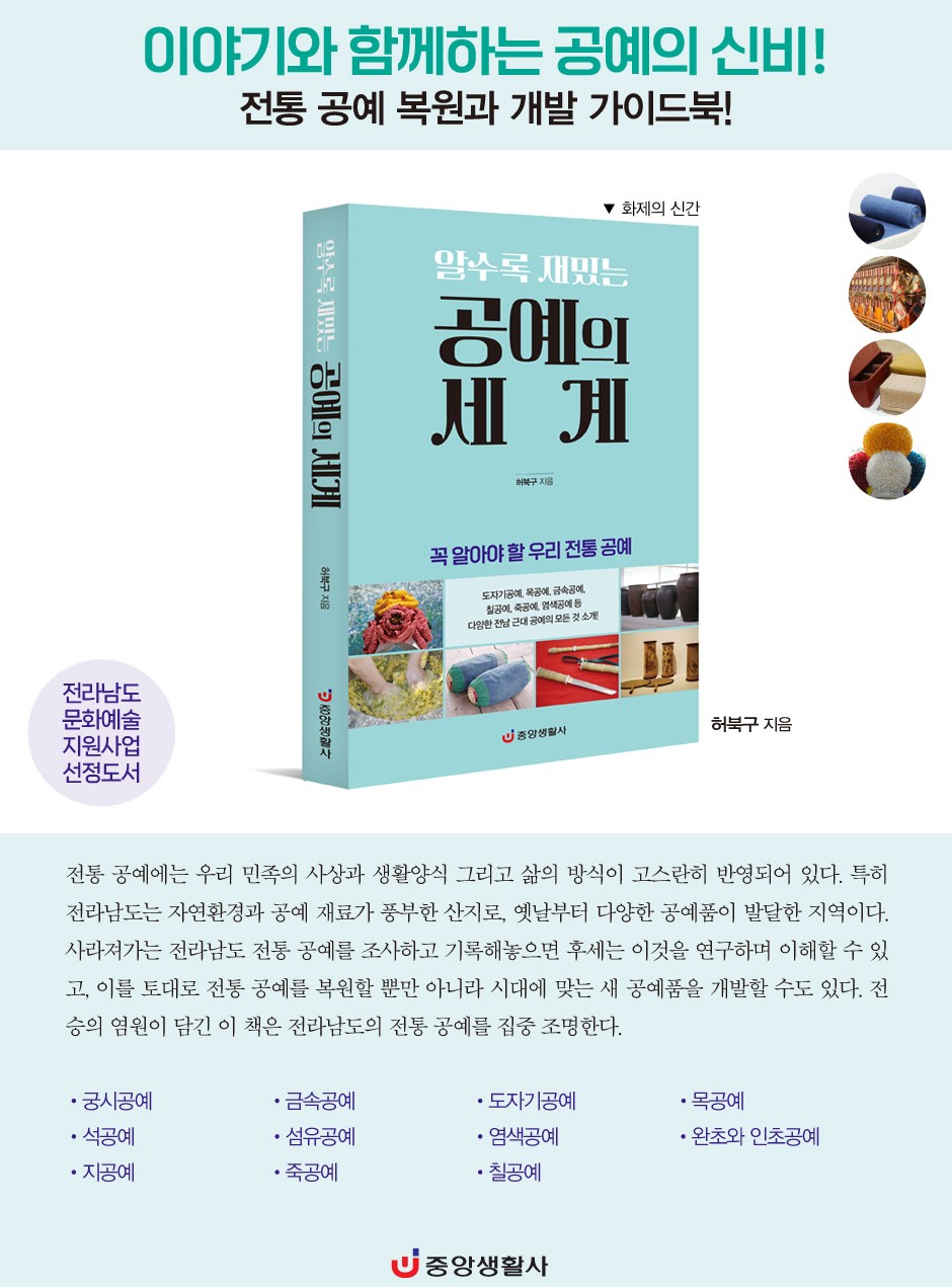 ¿ì¸®³ª¶ó ÀüÅë °ø¿¹¿¡´Â ¿ì¸® ¹ÎÁ·ÀÇ »ç»ó°ú »ýȰ¾ç½Ä, ±×¸®°í »îÀÇ ¹æ½ÄÀÌ °í½º¶õÈ÷ ¹Ý¿µµÇ¾î ÀÖ´Ù. Àü¶ó³²µµ °ø¿¹ ¶ÇÇÑ ³²µµ Áö¿ª »ç¶÷µéÀÇ Àι®ÇРƯ¼º°ú ÇÔ²² »ýȰ¾ç½Ä, ±×¸®°í Áö¿ª¿¡¼ ³ª´Â Àç·áÀû Ư¼ºÀÌ ¹Ý¿µµÇ¸é¼ Àü½ÂµÇ¾î ¿Ô´Ù. ƯÈ÷ Àü³²Àº ÀÚ¿¬È¯°æ°ú °ø¿¹ Àç·á°¡ dzºÎÇÑ »êÁö·Î, ¿¾³¯ºÎÅÍ ´Ù¾çÇÑ °ø¿¹Ç°ÀÌ ¹ß´ÞÇÑ Áö¿ªÀÌ´Ù. - 4ÂÊ *** Àڱ⸦ ¿ÏÀüÈ÷ °ÇÁ¶½ÃŰ±â¿¡ ¾Õ¼ ¹«´Ì¸¦ À½°¢Çϰųª Âï°í ±× ÀÚ±¹¿¡ ¹éÅ䳪 ÀûÅ並 ¸Þ¿ö Ãʹú±¸À̸¦ ÇÑ ÈÄ Ã»ÀÚÀ¯¸¦ ¹ß¶ó¼ ±Á´Â ¡®»ó°¨¹ý¡¯Àº ¿ì¸®³ª¶óÀÇ µ¶Ã¢ÀûÀÎ ¹æ¹ýÀÌ´Ù. ¶ÇÇÑ Ã»ÀÚÀÇ ÀºÀºÇÑ Çª¸¥ºûÀº ¼¼°è ¾îµð¼µµ Èä³»³»±â ¾î·Á¿î µ¶Æ¯ÇÑ »ö°¨À» ÀÚ¶ûÇÑ´Ù. ±¹º¸¿Í º¸¹°·Î ÁöÁ¤µÈ ûÀÚÀÇ 70%°¡ °Áø¿¡¼ ¸¸µé¾îÁ³À» Á¤µµ·Î °ÁøÀº ¼¼°èÀûÀ¸·Î ¿ì¼öÇÑ °í·ÁûÀÚÀÇ »êÁö¿´´Ù. - 54ÂÊ *** Áö±Ýµµ ÇØ³² ¿Á°ø¿¹ÀÇ ÀüÅëÀ» ÀÕ°í ¸í¼ºÀ» Áö۰íÀÚ ³ë·ÂÇÏ´Â À̵éÀÌ ÀÖ´Ù. À̵éÀº °í°¡ÀÇ ÀÛǰ Á¦ÀÛ°ú ÇÔ²² ÀϹÝÀεéÀÌ ½±°Ô Á¢ÇÒ ¼ö ÀÖ´Â µµÀå, ¸íÆÐ, ³«°ü µî ÁÖ¹®ÀÚÀÇ ÃëÇâ¿¡ ¸Â´Â °ø¿¹Ç°À» ¸¸µé¾î ³»¸ç ¿Á°ø¿¹ ÁöŰ±â¿¡ ¾È°£ÈûÀ» ½ñ°í ÀÖ´Ù. ÇØ³²±º¿¡¼µµ ÀÌ·¯ÇÑ ³ë·ÂµéÀ» ÀÎÁ¤ÇÏ¿© 2015³â¿¡ ¿Á°ø¿¹ ¸íÀÎ 3ÀÎÀ» ÇØ³²±º ÇâÅä¹®ÈÀ¯»êÀ¸·Î ÁöÁ¤, º¸Á¸Çϰí ÀÖ´Ù. - 115ÂÊ *** Àü³²¿¡ °ÅÁÖÇÏ´Â °í·ÉÀÚµéÀ» ´ë»óÀ¸·Î ÂÊ¿°»öÀ» Á¶»çÇÑ °á°ú 1940³â´ë±îÁö Àü³² °÷°÷¿¡¼ ÂÊ¿°»öÀÌ ÀÌ·ç¾îÁø °ÍÀ¸·Î ³ªÅ¸³µ´Ù. 2016³â¿¡ 90¼¼ ÀÌ»óÀÇ °í·ÉÀÚ Áß¿¡´Â ÂÊ¿°»öÀ» Á÷Á¢ ÇØ º» °æÇèÀڵ鵵 ´Ù¼ö ÀÖ¾ú´Ù. ³ªÁֽà ºÀȲ¸é ¿ëÀü¸® Áöµ¿¸¶À»ÀÇ °æ¿ì 1940³â´ë¿¡´Â 80% ÀÌ»óÀÇ °¡Á¤¿¡¼ ÂÊÀ» Àç¹èÇϰí, Âʹ°À» ¿°»öÇß´ø °ÍÀ¸·Î Á¶»çµÇ¾ú´Ù. - 173ÂÊ *** ´ã¾çÀº ¿ì¸®³ª¶ó¿¡¼ Á×°ø¿¹°¡ ¹ß´ÞÇÑ ´ëÇ¥ÀûÀÎ Áö¿ªÀÌ´Ù. ´ã¾çÀÇ Á×°ø¿¹°¡ ¹ß´ÞÇÑ ¹è°æ¿¡´Â Àç·á Ãø¸é¿¡¼ Á׸² Á¶¼º¿¡ ¾Ë¸ÂÀº ±âÈÄÁ¶°Ç°ú dzºÎÇÔÀÌ ÀÖ´Ù. ±× Àç·á¸¦ ¸¸µå´Â ±â¼úÀÇ Àü½Â°ú º¸±Þ, ´Ù¾çÇÏ°í ¼ö¿ä Áõ°¡¿¡ ´ëÀÀÇÏ´Â °úÁ¤¿¡¼ ±Ô¸ðÈ¿Í ºÐ¾÷È, Áö¸®Àû ¹× »ý¾÷ ¼ö´Ü¿¡¼ »ý»ê¼ºÀÇ ºñ±³ ¿ìÀ§¼º, Á¤Ã¥Àû Áö¿ø µî °¢ ¿äÀÎÀÌ °áºÎµÇ¸é¼ µ¶º¸ÀûÀÎ Á×¼¼°ø »êÁö·Î¼ ¸í¼ºÀ» ¶³Ä£ Áö¿ªÀÌ´Ù. - 240ÂÊ ÃâÆÇ»ç ¼Æò* »ýȰ µµ±¸·Î¼ÀÇ ÀüÅë °ø¿¹!
