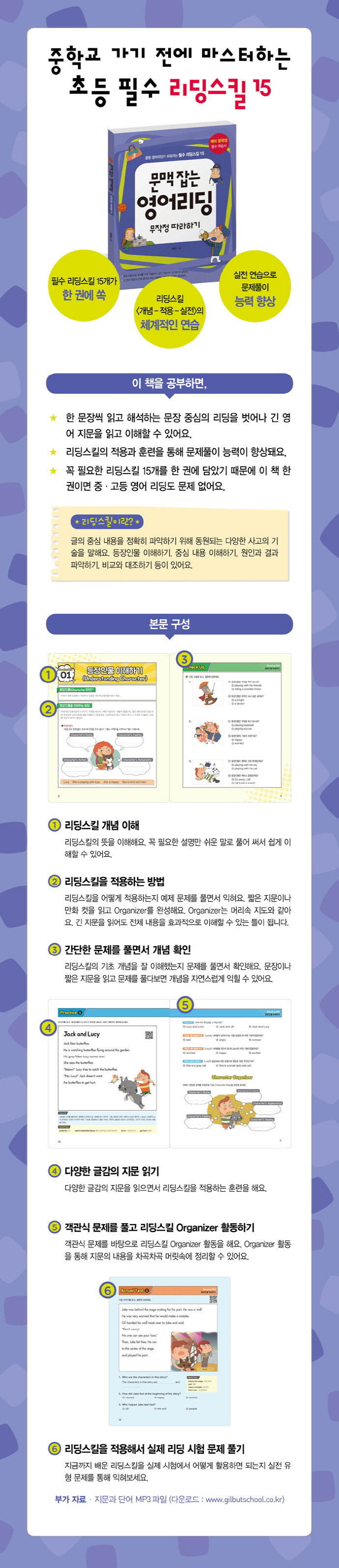ÀÌ ±³Àç´Â Çȼǰú ³íÇÈ¼Ç µî ´Ù¾çÇÑ Áö¹®À» ÀÐ¾î ³ª°¡´Â µ¥ ²À ÇÊ¿äÇÑ ¸®µù½ºÅ³ 15°³¸¦ ÇÑ ±Ç¿¡ ´ã¾Ò½À´Ï´Ù. ¿µ¾î Áö¹®ÀÌ ±æ¾îÁö´Â ÁßÇб³ °¡¼µµ ´çȲÇÏÁö ¾Êµµ·Ï ÃÊµî °úÁ¤¿¡¼µµ ÃæºÐÈ÷ ÀÍÈ÷°í ¿¬½ÀÇÒ ¼ö ÀÖ´Â Çʼö ¸®µù½ºÅ³ 15°³¸¦ ¾ö¼±Çß½À´Ï´Ù. ÀÌ Ã¥¿¡ ½Ç¸° Áö¹® 75°³¸¦ ÅëÇØ ¸®µù½ºÅ³À» ÀÍÈ÷°í Àû¿ëÇÏ´Â ¿¬½ÀÀ» ÇÏ¸é ³²µéº¸´Ù ¿ùµîÇÑ ¸®µù ½Ç·ÂÀ» °®Ãâ ¼ö ÀÖ½À´Ï´Ù.
