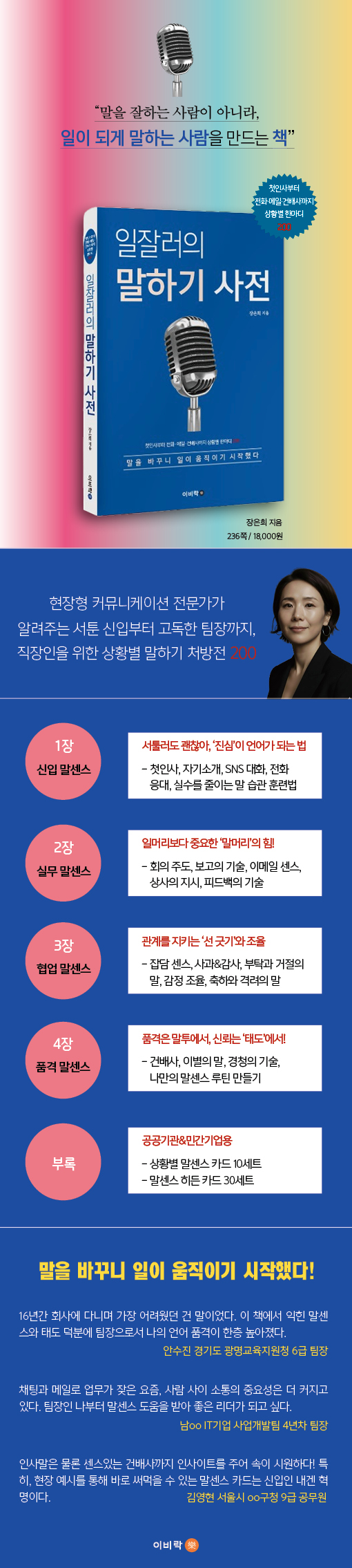 ½Ç·ÂÀº Á¾ÀÌ ÇÑ Àå Â÷ÀÌÁö¸¸, ±× ½Ç·ÂÀ» °á°ú·Î ¹Ù²Ù´Â °ÍÀº °á±¹ ¡®¸»¡¯ÀÌ ¾Æ´Ò±î. ¡ºÀÏÀß·¯ÀÇ ¸»Çϱ⠻çÀü¡»(ºÎÁ¦: ùÀλçºÎÅÍ ÀüȤý¸ÞÀϤý°Ç¹è»ç±îÁö »óȲº° ÇѸ¶µð 200)Àº Á÷Àå »ýȰÀ» 1³â Â÷, 5³â Â÷, 10³â Â÷, 15³â Â÷, Áï 4´Ü°è·Î ³ª´©¾î, °¢ ½Ã±â¸¶´Ù ¸¶ÁÖÇÏ°Ô µÇ´Â °áÁ¤ÀûÀÎ ´ëÈÀÇ ¼ø°£µéÀ» 200°¡Áö ½ÇÀü ¹®ÀåÀ¸·Î Á¤¸®ÇÏ¿´´Ù.