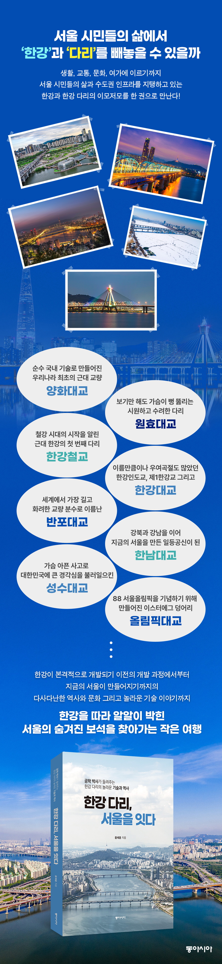Åä¸ñ°ú ±³·®À» Àü°øÀ¸·Î ÇÏ´Â ÀúÀÚ´Â ¼¿ï°ú ÇѰÀ̶ó´Â Ưº°ÇÑ °ø°£À» ¿¹ÂùÇÏ´Â °ÍÀ¸·Î ÀÌ Ã¥À» ½ÃÀÛÇÑ´Ù. ÇѰÀÌ ¡®ÇѰ¡¯À̶ó°í ºÒ¸®±â ÀÌÀüÀÇ ¿À·£ °ú°Å¿¡¼ºÎÅÍ ½ÃÀÛÇØ ¹° È帣µí õõÈ÷ ÇѰ°ú ÇѰ¿¡ ³õÀÎ ±³·®µéÀÇ ¿ª»ç¸¦ ÃßÀûÇÑ´Ù. ¡®ÇѰ ´Ù¸®ÀÇ ¿ª»ç¡¯¶ó°í ÇÏ´õ¶óµµ À¸·¹ ¿ª»ç°¡ ±×·¯ÇϵíÀÌ, ÇѰ ´Ù¸®ÀÇ ¿ª»ç´Â ¿À·ÔÀÌ ÇѰ ´Ù¸®¸¸ÀÇ À̾߱Ⱑ ¾Æ´Ï´Ù. ÀÏÁ¦ °Á¡±â ±³·®À» °Ç¼³Çϱ⿡ ¾Õ¼ öµµºÎ¼³±ÇÀ» ³õ°í ¹ú¾îÁø ÀÏÁ¦¿Í ¹Ì±¹ »çÀÌÀÇ °æÀï, °Ã¶·Î ´Ù¸®¸¦ Áþ±â À§Çؼ ÇÊ¿äÇß´ø ö°ÀÇ ¹ßÀü°ú ö°ÀÌ ¾Æ½Ã¾Æ ¿ª»ç¿¡ ¹ÌÄ£ ¿µÇâ, 6¤ý25ÀüÀïÀÌ ´Ù¸®¿¡ ¹ÌÄ£ ¿©ÆÄ¿Í °ø½À, Çö´ë¿¡ À̸£·¯¼´Â °¡½¿ ¾ÆÇ ¼º¼ö´ë±³ ºØ±«»ç°í¿Í ¼Ò¾ç°´ï ºØ±«, ¼¿ï ´ëÈ«¼ö¿¡ À̸£±â±îÁö ±ÙÇö´ë»çÀÇ ±½Á÷ÇÑ »ç°ÇµéÀÌ ÇѰ°ú ÇѰ ´Ù¸®¸¦ µÑ·¯½Î°í ÀϾ´Ù. ±× ¸ðµç °ÍÀÌ ÇѰ ´Ù¸®ÀÇ ¿ª»çÀ̸ç, µ¿½Ã¿¡ ÇѰÀÇ ¿ª»çÀÌ°í ¼¿ïÀÇ ¿ª»çÀ̱⵵ ÇÏ´Ù. ÀúÀÚ´Â ¼øÇ÷ À̰ø°èÀδäÁö ¾ÊÀº °¨¼º ¾î¸° ÇÊÄ¡·Î ÇѰÀÇ ¿ª»ç¸¦ ÈÈÀ¸¸ç ÇѰ°ú ÇѰ ´Ù¸®¸¦ µÑ·¯½Ñ ±â¼ú°ú ¿ª»ç À̾߱⸦ ¸À±ò³ª°Ô Àü´ÞÇÑ´Ù.
