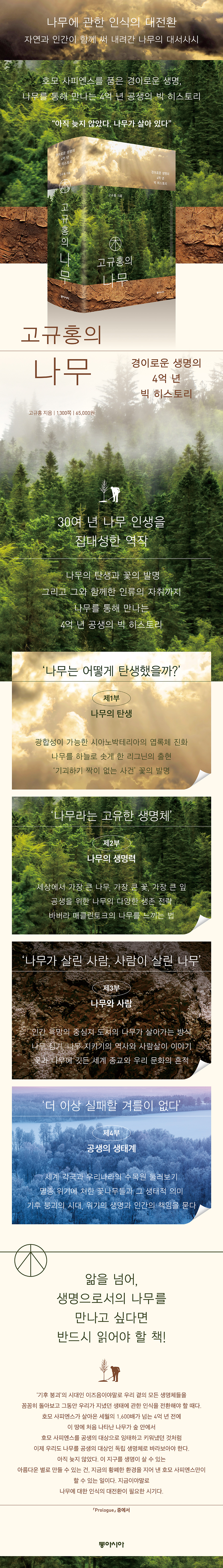 Ã¥Àº ³ª¹«ÀÇ ¿ª»ç»Ó ¾Æ´Ï¶ó 30¿© ³â°£ ÀúÀÚ°¡ ¾ÖƶÇÏ°Ô ¹Ù¶óº¸¸ç ½×¾Æ¿Â »ý¸íÀÇ ±â·Ï°ú °æÇèÀ» Ãѵ¿¿øÇØ °¡Àå ³·Àº °÷¿¡¼ ÀÚ¶ó´Â À̳¢ºÎÅÍ Àηù°¡ ÁöÄѿ ±¹³»¿Ü ½£°ú »ýŰè, ±× Àι®ÇÐÀû Àṉ̀îÁö ¿ÂÀüÈ÷ ´ã¾Æ³Â´Ù. ¼¼°è °¢¾ç°¢»ö ³ª¹«¿¡ ¾ôÈù Áø±ÍÇÑ À̾߱⵵ °¡µæÇÏ´Ù. »ýÅÂ¿Í ³ª¹«¸¦ ÀÌÇØÇÏ·Á Çß´ø ¼ö¸¹Àº °úÇÐÀÚµéÀÇ À̷аú »î¿¡¼ ½ÃÀÛÇØ ¼¼°è¿¡¼ °¡Àå Å« ³ª¹«, °¡Àå ¿À·¡µÈ ³ª¹«, ²É°ú ³ª¹«ÀÇ ³î¶ó¿î »ýÁ¸ Àü·«, ¾¾¾ÑÀ» ÁöŰ´Â ±¹³»¿Ü ½Ãµåº¼Æ® ±×¸®°í ¼¼°è °¢ÁöÀÇ ¼ö¸ñ¿ø°ú ½Ä¹°¿ø, ±¹³» õ¿¬±â³ä¹°°ú Áö¹æ±â³ä¹° ³ª¹«±îÁö »ýÅÂÀι®ÇÐÀû Áö½ÄÀÌ ³î¶øµµ·Ï Èï¹Ì·Ó°Ô ÆîÃÄÁø´Ù.