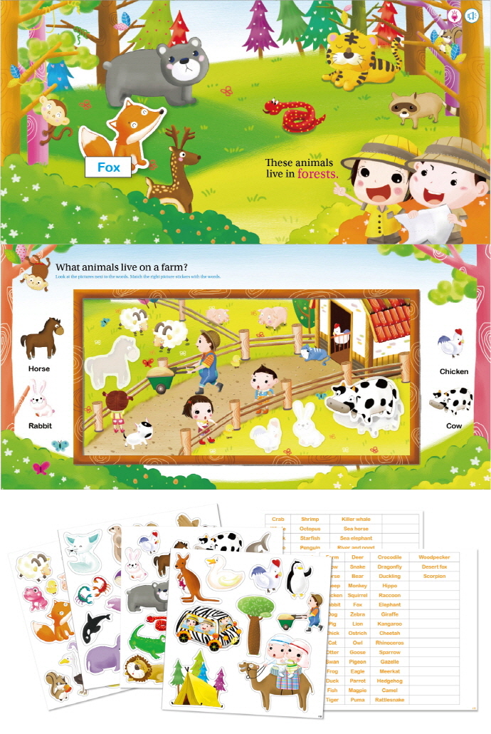 ±ÛÀÚ¿Í ±×¸²À» ¼¼ÀÌÆæÀ¸·Î ÂïÀ¸¸é ¼º¿ì°¡ ´Ü¾î¿Í ¹®ÀåÀ» ÀоîÁÖ°í, ´Ù¾çÇÑ È¿°úÀ½À» ÅëÇØ ¾ÆÀ̵éÀÌ »ç¹°ÀÇ Æ¯Â¡À» ½±°Ô ÆÄ¾ÇÇÒ ¼ö ÀÖµµ·Ï ÇÏ¿´À¸¸ç, ½ºÆ¼Ä¿ ³îÀÌ ¹æ¹ýµµ ¼¼ÀÌÆæÀÌ ¸ðµÎ ÀоîÁֱ⠶§¹®¿¡ ¾ÆÀÌ È¥ÀÚ¼µµ Àç¹ÌÀÖ´Â ½ºÆ¼Ä¿ ³îÀ̸¦ ÇÒ ¼ö ÀÖ´Ù. Á¦2±Ç¿¡¼´Â ¸», Åä³¢, ´ß, ¼Ò, °õ, È£¶ûÀÌ µî ¾ÆÀ̵éÀÌ ÁÁ¾ÆÇÏ´Â µ¿¹°µéÀÇ Æ¯¼º°ú »ç´Â °÷À» ¿µ¾î·Î ¹è¿ì°í ÀÍÈú ¼ö ÀÖ´Ù.