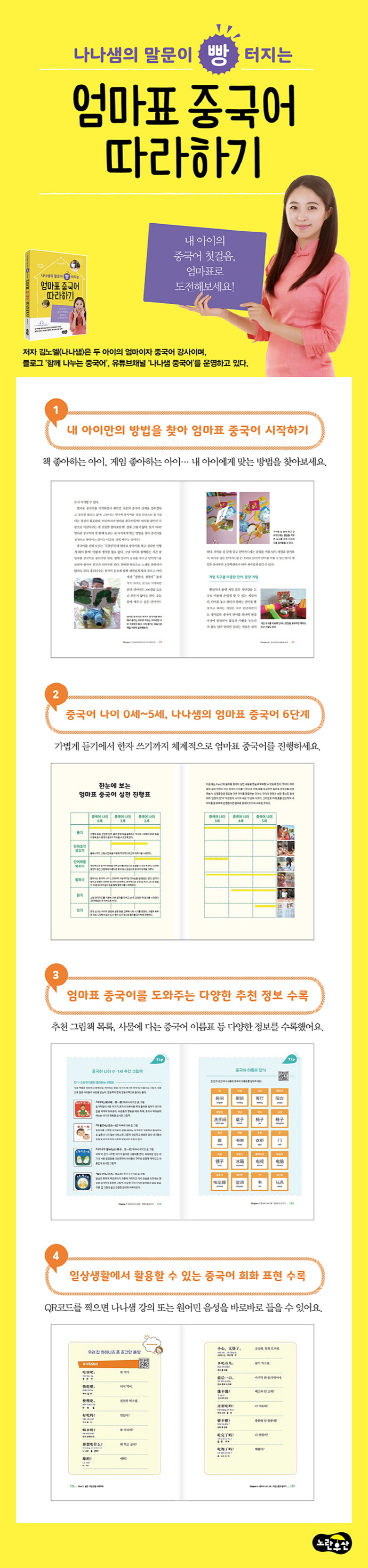 ¿Ü±¹¾î´Â ÃÖ´ëÇÑ ¾î¸± ¶§ºÎÅÍ ½ÃÀÛÇØ¾ß ÇÒ ÅÙµ¥ ±×·¸´Ù¸é Áß±¹¾îµµ Á¶±â±³À°À» ÇØ¾ß ÇÏ´Â °ÇÁö ±Ã±ÝÇØÇÏ´Â ¾ö¸¶µéÀÌ ¸¹´Ù. ¡¶³ª³ª»ùÀÇ ¸»¹®ÀÌ »§ ÅÍÁö´Â ¾ö¸¶Ç¥ Áß±¹¾î µû¶óÇϱ⡷ÀÇ ÀúÀÚ ±è³ë¿¤(³ª³ª»ù)Àº ¾ÆÀÌ¿¡°Ô Áß±¹¾î¸¦ °¡¸£Ä¡°í ½Í´Ù¸é ¡®¾ö¸¶Ç¥¡¯·Î ½ÃÀÛÇØº¼ °ÍÀ» ÃßõÇÑ´Ù. Áß±¹¾î °»ç·Î ¿©¼¸ »ì ¾Æµé°ú ¼¼ »ì µþÀ» Áý¿¡¼ ¾ö¸¶Ç¥·Î °¡¸£Ä¡°í ÀÖ´Â ÀúÀÚ´Â Áß±¹¾î¸¦ ¸ð¸£´Â ¾ö¸¶µéµµ ½±°í Áñ°Ì°Ô ½ÃÀÛÇÒ ¼ö ÀÖµµ·Ï Áß±¹¾î Á¶±â±³À° ºñ¹ýÀ» ÇÑ ±ÇÀ¸·Î Á¤¸®Çß´Ù.