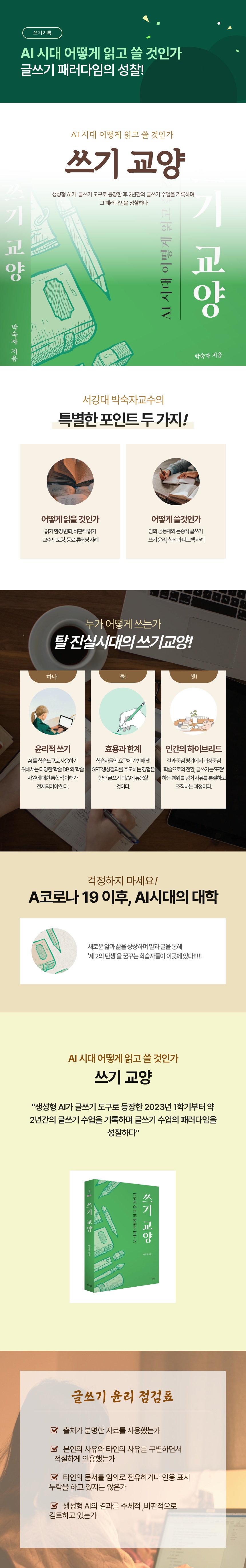 ÀÚº»ÁÖÀÇÀû °ü°è ¾È¿¡¼ ¡®ÁÁÀº Ã¥¡¯ÀÌ ¾î¶»°Ô ¿Ö°îµÇ´ÂÁö ±× °úÁ¤À» ÃßÀûÇÑ ¡º¼Ó¹°±³¾çÀÇ Åº»ý¡», ÇØ¹æ ÀÌÈĺÎÅÍ 1970³â´ë±îÁö ¡®Ã»³â¡¯µéÀÇ ¡®Ã¥ Àб⡯¿¡ ÁÖ¸ñÇÑ µ¶¼¹®È»ç¸¦ ±â·ÏÇÑ ¡º»ì¾Æ³²Áö ¸øÇÑ ÀÚµéÀÇ Ã¥ Àб⡻ µîÀÇ Àú¼¸¦ ÅëÇØ µ¶¼¹®È¿Í ±³¾ç, ±Ù´ë¹®ÇÐ(È)¿¡ ÃµÂøÇØ¿Â ÆÄ¿ö ¶óÀÌÅÍ(power writer) ¹Ú¼÷ÀÚ ±³¼öÀÇ ½Å°£ ¡º¾²±â ±³¾ç¡»ÀÌ Ãâ°£µÇ¾ú´Ù. ¼°´ëÇб³ ÀüÀα³À°¿ø ±³¼ö·Î ±Û¾²±â¸¦ °¡¸£Ä¡°í ÀÖ´Â ÀúÀÚ´Â »ý¼ºÇü AI°¡ ±Û¾²±â µµ±¸·Î µîÀåÇÑ 2023³â 1ÇбâºÎÅÍ ¾à 2³â°£ÀÇ ±Û¾²±â ¼ö¾÷À» ²Ä²ÄÈ÷ ±â·ÏÇÏ¸ç ±Û¾²±â ¼ö¾÷ÀÇ ÆÐ·¯´ÙÀÓÀ» ¼ºÂûÇØ¿ÔÀ¸¸ç, ±× ¼ºÂûÀÇ °úÁ¤°ú °á°ú¸¦ Ã¥ Àü¹Ý¿¡ ÃÎÃÎÈ÷ »õ°Ü³õ¾Ò´Ù.