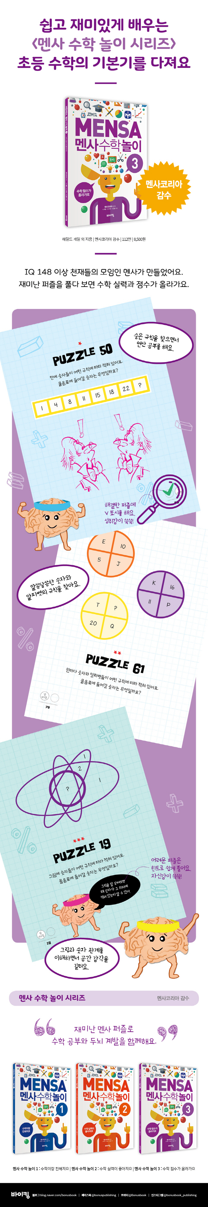¸à»ç´Â Áö´ÉÁö¼ö »óÀ§ 2% õÀçµéÀÇ ¸ðÀÓÀÔ´Ï´Ù. ¸Ó¸® ¾²±â¸¦ ÁÁ¾ÆÇÏ´Â ¸¸Å ¿µ±¹¸à»çÀÇ ÇÙ½É ¸â¹öµéÀº ¡¶¸à»ç Ã߸® ÆÛÁñ¡·À» ºñ·ÔÇÑ ¿©·¯ ¸à»ç ÆÛÁñÀÇ ½ºÅ׵𼿷¯¸¦ Æì³» ¿Ô¾î¿ä. <¸à»ç ¼öÇÐ ³îÀÌ>´Â ¾ÆÀ̵éÀ» À§ÇØ ¸¸µç ÆÛÁñÀ̶ø´Ï´Ù. ³À̵µ¿¡ µû¶ó ¡ì¸à»ç ¼öÇÐ ³îÀÌ 1 : ¼öÇÐÀ̶û Ä£ÇØÁ®¿ä¡í ¡ì¸à»ç ¼öÇÐ ³îÀÌ 2 : ¼öÇÐ ½Ç·ÂÀÌ ÁÁ¾ÆÁ®¿ä¡í ¡ì¸à»ç ¼öÇÐ ³îÀÌ 3 : ¼öÇÐ Á¡¼ö°¡ ¿Ã¶ó°¡¿ä¡í ÀÌ·¸°Ô 3±ÇÀ¸·Î ±¸¼ºÇß½À´Ï´Ù. ÆÛÁñ Ã¥¸¶´Ù ¾ÆÀ̵éÀÇ È£±â½ÉÀ» ÀÚ±ØÇÏ´Â ÆÛÁñÀÌ °¡µæÇØ¿ä. ¸ö¿¡ ¼ýÀÚ°¡ °¡µæ »õ°ÜÁø °ø·æÀÌ ³ª¿À°í, ´Ü ÇϳªÀÇ ¼ýÀÚ°¡ ÀÖ¾î¾ß ¹ß»çÇÒ ¼ö ÀÖ´Â ¿ìÁÖ¼±ÀÌ µîÀåÇÕ´Ï´Ù. ½Å³ª°Ô ÆÛÁñÀ» Ç®´Ù º¸¸é ¾ÆÀ̵éÀÇ µÎ³ú´Â Ȱ¹ßÇØÁý´Ï´Ù. ¸à»ç°¡ ¸¸µç ÆÛÁñÀ̶ó°í ÇØ¼ õÀçµé¸¸ Ç® ¼ö Àְųª ¼öÇÐÀ» ÀßÇÏ´Â ¾ÆÀ̸¸ Ç® ¼ö ÀÖ´Â ¹®Á¦µéÀÌ ¾Æ´Õ´Ï´Ù. ÆÛÁñÀ» Áñ±â´Â ¸¶À½À¸·Î Ǭ´Ù¸é Ç®Áö ¸øÇÒ ÆÛÁñÀº ¾ø´ä´Ï´Ù.
