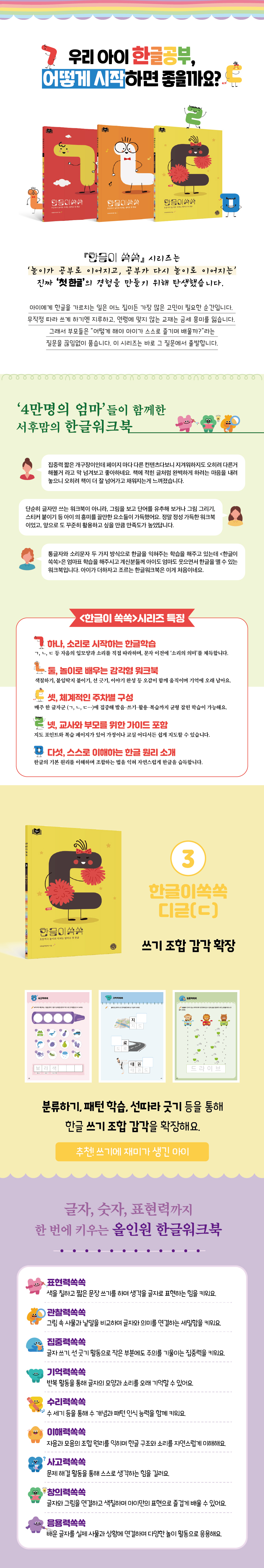 ¡ºÇѱÛÀÌ ½ï½ï¡» ½Ã¸®Áî´Â 2³â°£ 4¸¸ ¸í ¾ö¸¶µéÀÇ ¼±ÅÃÀ» ¹ÞÀº ¡®¼Èĸ¾¡¯ÀÇ ´©Àû ³ëÇϿ츦 Áý´ë¼ºÇÑ ¸ÂÃãÇü ÇÑ±Û ¿öÅ©ºÏÀÌ´Ù. ¼Ò¸® Áß½ÉÀÇ ÇÑ±Û ¿ø¸®¸¦ ³îÀÌó·³ ÀÍÈú ¼ö ÀÖµµ·Ï ¼³°èµÇ¾î, ¾ÆÀ̰¡ ½º½º·Î Ã¥À» ÆîÄ¡°í ½Í¾î ÇÏ´Â ¡®ÀÚ±âÁÖµµ ÇнÀÀÇ Ã¹ °æÇ衯À» ¸¸µé¾îÁØ´Ù.