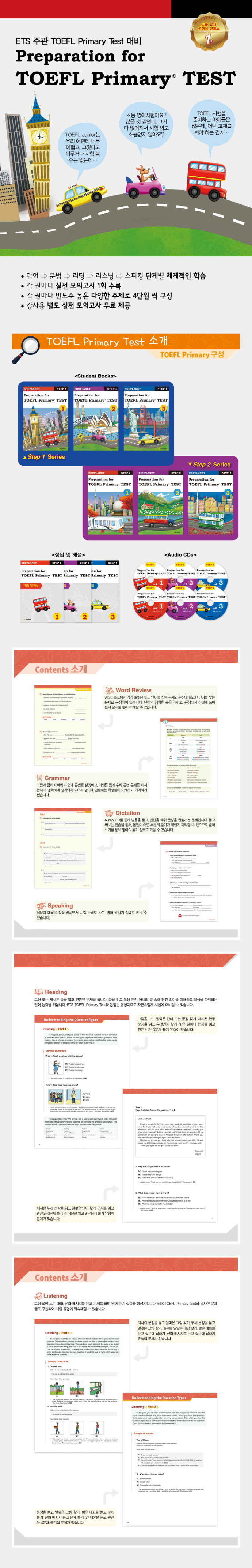 ¿µ¾î¸¦ ¸ð±¹¾î·Î ÇÏÁö ¾Ê´Â 8¼¼ ÀÌ»ó ÇлýµéÀÌ TOEFL Primary Test¿¡ ÀÀ½Ã °¡´ÉÇϸç, ÀÌ Ã¥Àº °ø½Å·Â ÀÖ´Â ±â°üÀÎ ETSÀÇ TOEFL ù ¹øÂ° ·¹º§ÀÎ TOEFL Primary Test¸¦ ´ëºñÇÏ´Â ÇлýµéÀ» ´ë»óÀ¸·Î ÇÑ´Ù. ¶ÇÇÑ ¿µ¾îÀÇ Àбâ¿Í µè±â ½Ç·ÂÀ» ½×À» ¼ö ÀÖµµ·Ï ´Ù¾çÇÑ ÁÖÁ¦ÀÇ µ¶ÇØ Áö¹®°ú ½Ç»ýȰ¿¡¼ Ç¥ÇöÇÏ´Â µè±â ´ëº»À» Á¦½ÃÇÏ¿© ¿µ¾î ¼ºÀû Çâ»óÀ» ¿øÇÏ´Â Çлýµé¿¡°Ô ÁÁÀº Áöħ¼ÀÌ´Ù.