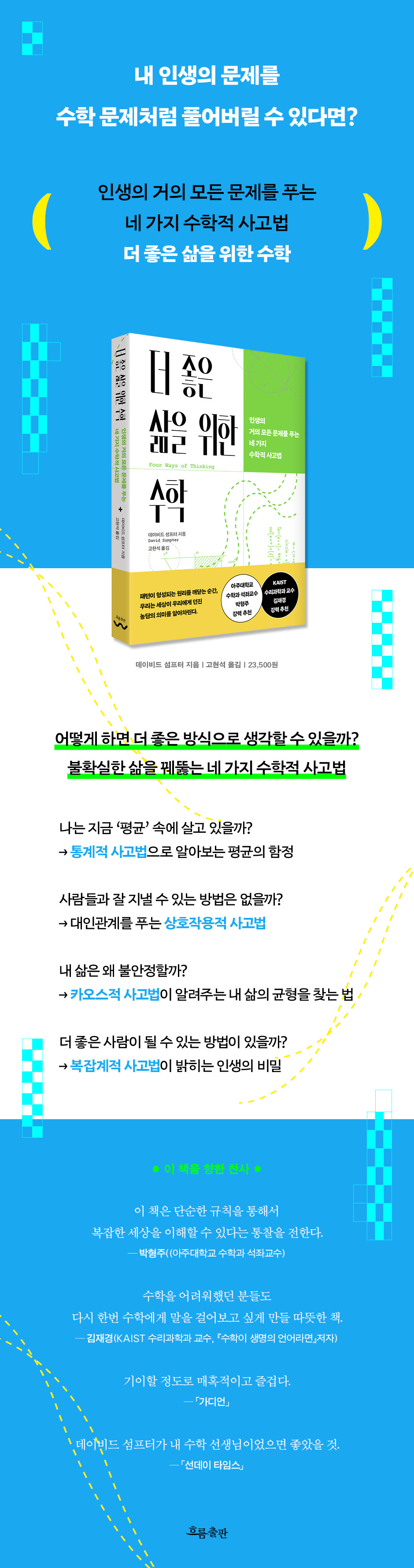 ±¸±Û, Å׵忢½º(TEDx), ¿Á½ºÆÛµå µî¿¡¼ °¿¬Çϰí, ¿©·¯ ¸Åü¿¡ ±â°íÇÏ¸ç ´ëÁß ¼öÇÐ Ä¿¹Â´ÏÄÉÀÌÅͷΠȰ¹ßÈ÷ Ȱµ¿ÇÏ´Â ÀúÀÚ´Â º¹Àâ°è ¿©¸§Çб³¿¡ Âü°¡Çß´ø ÀÚ½ÅÀÇ °æÇèÀ» °¢»öÇÑ ÀÌ Ã¥¿¡¼ ¿©·¯ ¼öÇÐ °³³äµéÀ» ÀÌÇØÇϱ⠽±°Ô ¼³¸íÇÑ´Ù. ¶ÇÇÑ ÁÖÀΰøÀÎ ÀúÀÚÀÇ À̾߱â¿Í ÇÔ²² ¼öÇÐÀÌ °ð »îÀ̾ú´ø ¼öÇÐÀÚµéÀÇ À̾߱⵵ ÇÔ²² º¸¿©ÁØ´Ù. Ã¥¿¡¼´Â ÇǽÄÀÚ-Æ÷½ÄÀÚ ¸ðµ¨·Î ÀÚ¿¬Àº ²÷ÀÓ¾øÀÌ ¼øÈ¯ÇÏ¸ç ¼·Î ¿µÇâÀ» ÁÖ°í¹Þ´Â´Ù´Â ¿ªµ¿¼ºÀ» ¼³¸íÇÑ ¡®¾ËÇÁ·¹Æ® ·ÎƮ, ¼öÇÐÀû Ã߷йýÀ¸·Î ¿ìÁÖ¼± ¹ß»ç¿Í ÀÌÂø·ú ÇÁ·Î±×·¥ÀÇ ¿ÀÂ÷¸¦ ȹ±âÀûÀ¸·Î ÁÙ¿© ¾ÆÆú·Î 11È£ ÀÓ¹« ¼º°ø¿¡ ±â¿©ÇÑ ¡¯¸¶°Å¸´ ÇØ¹ÐÅÏ¡®, ¼öÇÐÀÇ º¹Àâµµ¿Í »îÀÇ °¡Ä¡¸¦ ¿¬°áÇÑ, Çö´ë ¼öÇл翡¼ »©³õÀ» ¼ö ¾ø´Â õÀç ¡®¾Èµå·¹ÀÌ ´ÏÄݶ󿹺ñÄ¡ Äݸð°í·ÎÇÁ¡¯µî À§´ëÇÑ ¼öÇÐÀÚµéÀÇ »îÀ» ÇÔ²² »ìÆìº¼ ¼ö ÀÖ´Ù. ±×µéÀÌ Àϰú Ä¿¸®¾î, ¿ìÁ¤°ú »ç¶û µî ÀÏ»óÀÇ ¹®Á¦µéÀ» ¼öÇÐÀû »ç°í·Î ÇØ°áÇÏ´Â ¸ð½ÀÀ» ÅëÇØ ¼öÇÐÀû »ç°í¹ýÀ» ³» »î¿¡ Àû¿ëÇÏ´Â ¹ýÀ» ½±°Ô ¹è¿ï ¼ö ÀÖ´Ù.