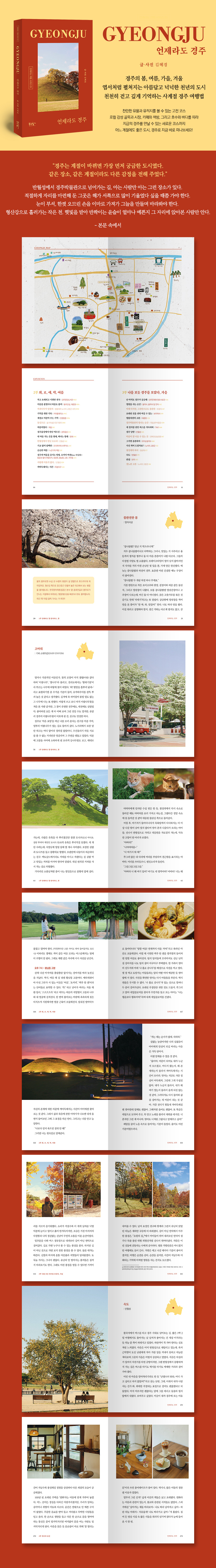 ÀÌ Ã¥¿¡¼´Â õõÈ÷ °È°í ±í°Ô ±â¾ïÇÏ´Â °æÁÖ¸¦ ¸¸³ª´Â ¹æ¹ýÀ» ¾È³»ÇÑ´Ù. ´ë¸ª¿ø, ÷¼º´ë, µ¿±Ã°ú ¿ùÁö, ºÒ±¹»ç °°Àº °íÀü ·çÆ®´Â °èÀý¿¡ ¸ÂÃá °È±â ÁÁÀº µ¿¼±À¸·Î ¿«¾ú´Ù. ¿©±â¿¡ Ȳ¸®´Ü±æ, °æÁÖ¹Ú¹°°ü, ¹Ì¼ú°ü µî ¡®Áö±ÝÀÇ °æÁÖ¡¯¸¦ º¸¿©ÁÖ´Â Àå¼Òµé°ú ¹Ý¿ù¼º, ³ë¼¸®, ÁøÆò¿Õ¸ª, Ȳ¿Àµ¿ °ñ¸ñ, °¨Æ÷ ÇØ±¹±æÃ³·³ ¹ß±æÀ» ¸ØÃß°Ô ÇÏ´Â Àå¼Òµéµµ ´ã¾Ò´Ù. »§°ú Ä¿ÇÇ, ±¹¼ö¿Í ºñºö¹ä, ·Î½ºÅ͸®¿Í ¼Á¡, µµ¿¹ üÇè µî °æÁÖ¿¡¼ ¹Ù·Î ½ÇõÇÒ ¼ö ÀÖ´Â ¿©Á¤À» Å¥·¹À̼ÇÇϰí, ¾Ë¾ÆµÎ¸é ÁÁÀº ½Ç¿ë Á¤º¸ ´õÇß´Ù. °æÁÖÀÇ »ç°èÀýÀÌ ¿±¼Ã³·³ ÆîÃÄÁö´Â ÀÌ Ã¥°ú ÇÔ²², °æÁÖÀÇ »õ·Î¿î °èÀýÀ» ¸¸³ª±â À§ÇÑ ¿©ÇàÀ» ÁغñÇØ º¸ÀÚ.