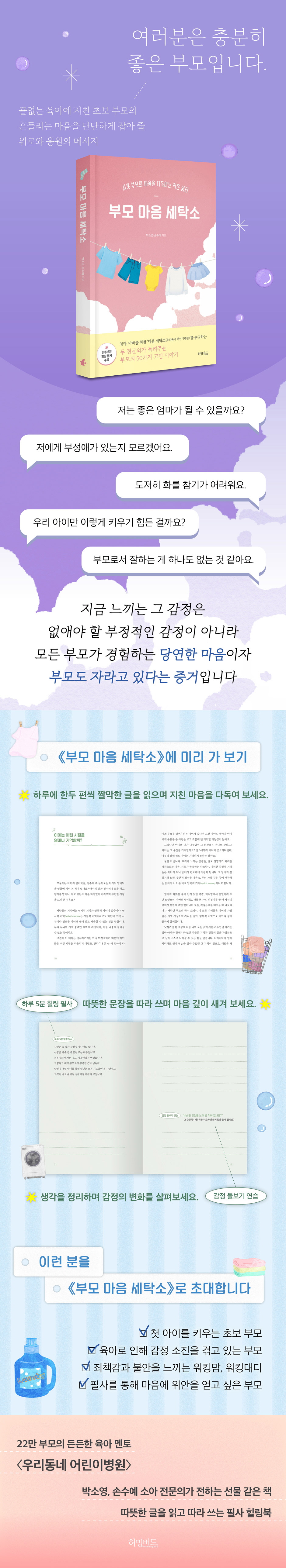 ±×·± ºÎ¸ð¸¦ À§ÇØ ¹Ú¼Ò¿µ, ¼Õ¼ö¿¹ ¼Ò¾Æ Àü¹®Àǰ¡ ³ª¼¹´Ù. ¡¶ºÎ¸ð ¸¶À½ ¼¼Å¹¼Ò¡·´Â À¯Æ©ºê ¡´¿ì¸®µ¿³× ¾î¸°À̺´¿ø¡µ¿¡¼ 22¸¸ ºÎ¸ð¿¡°Ô À§·Î¿Í Á¶¾ðÀ» ÀüÇØ ¿Â ¼Ò¾ÆÁ¤½Å°ú, ¼Ò¾Æ°ú Àü¹®Àǰ¡ º¸³»´Â µû¶æÇÑ ÀÀ¿øÀÇ ¸Þ½ÃÁö´Ù. Àü¹®ÀÇÀÌÀÚ ¾ö¸¶À̱⵵ ÇÑ µÎ ÀúÀÚ´Â »ó´ã½Ç¿¡¼ ¸¶ÁÖÇÑ ¿©·¯ À°¾Æ »ç·Êµé°ú ¾ö¸¶·Î¼ °æÇèÇÑ ÀڽŵéÀÇ ¼ÖÁ÷ÇÑ °í¹ÎÀ» Åä´ë·Î, ¸ðµç ºÎ¸ð°¡ °Þ´Â 6°¡Áö °¨Á¤(À¯´ë°¨, ºÒ¾È°¨, ±â»Ý, ÁËÃ¥°¨, ÇǷΰ¨, ȸº¹Åº·Â¼º)¿¡ ´ëÇÑ À̾߱⸦ Ã¥¿¡ ´ã¾Ò´Ù. Èçµé¸®´Â ºÎ¸ðÀÇ ¸¶À½À» ´Ü´ÜÈ÷ ºÙÀâ¾Æ ÁÙ ºû³ª´Â ¹®ÀåÀÌ °¡µæÇÏ´Ù. ÇÏ·ç¿¡ ¸î ²ÀÁö¾¿ ºÎ´ã ¾øÀÌ ±ÛÀ» Àаí, ÇÊ»ç °ø°£¿¡ ¡®³ª¸¦ À§ÇÑ ¹®À塯À» µû¶ó ¾²°í, ©¸·ÇÑ ¡®°¨Á¤ µ¹º¸±â ¿¬½À¡¯±îÁö Àû¾î ³»·Á°¡ º¸ÀÚ. ³ª¸¦ ÇâÇÑ ¹ÏÀ½°ú ¾ÆÀ̸¦ ÇâÇÑ »ç¶ûÀ¸·Î ¸¶À½ÀÌ Ãæ¸¸ÇØÁö´Â ¼ø°£ÀÌ Ã£¾Æ¿Ã °ÍÀÌ´Ù.