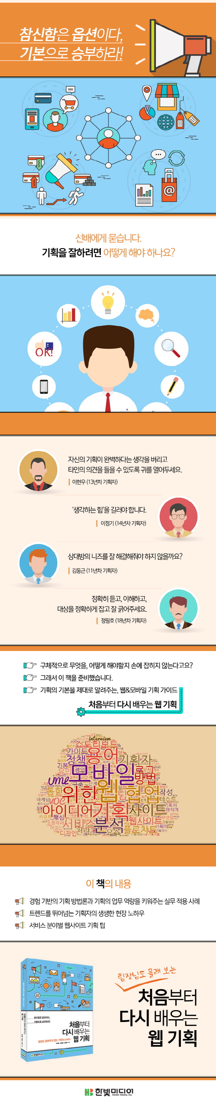 ¿À´Ã³¯ ÀÎÅͳÝÀº ¿ì¸® »îÀÇ ÀϺÎÀÌ´Ù. ÀÎÅͳݿ¡¼ À¥»çÀÌÆ®ÀÇ ¹æÇâÀ» ¼¼¿öÁÖ´Â »ç¶÷µéÀÌ ¹Ù·Î ±âȹÀÚÀÌ´Ù. ±âȹÀÚ´Â ¾î¶² Àç´ÉÀÌ ÀÖ¾î¾ß ÇÒ±î? Å»ýºÎÅÍ ÈǸ¢ÇÑ ±âȹÀÚ¶õ ¾ø´Ù. ±âȹ·ÂÀº ¸ö¿¡ »õ±â°í ž´Â °ÍÀÌ ¾Æ´Ï¶ó È£±â½É°ú °ü½É¿¡¼ ³ª¿Â´Ù. ÀÌ Ã¥¿¡¼´Â ±× ´©±¸µµ À̾߱âÇØÁÖÁö ¾Ê¾Ò´ø ±âº»ÀÇ Á߿伺°ú Ãʺ¸ ±âȹÀÚ°¡ °Þ´Â ¾î·Á¿òÀ» ¤¾î ¼ú¼ú Ç®¾îÁØ´Ù.