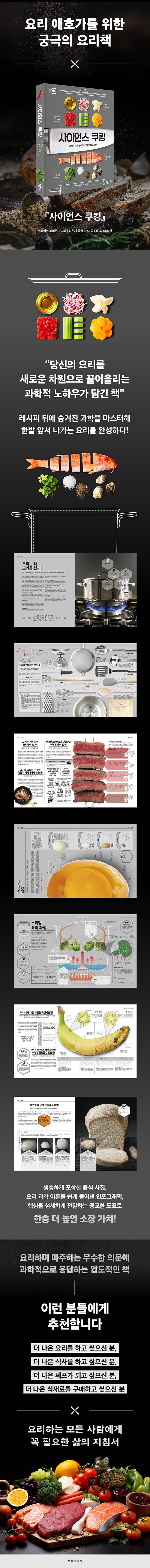 ¿ä¸® Ãʺ¸ÀÚµµ ½±°Ô ÀÌÇØÇÒ ¼ö ÀÖµµ·Ï ¸ðµç Á¶¸® °úÁ¤°ú Å×Å©´ÐÀ» ÇÑ´«¿¡ µé¾î¿À´Â »çÁø°ú µµÇ¥·Î Á¤¸®Çß´Ù. À°·ù, ¾îÆÐ·ù, ´Þ°¿, ¿ìÀ¯¿Í À¯Á¦Ç°, µÎ·ù, ¹Ð°¡·ç µî ¿ì¸®°¡ ÀÏ»óÀûÀ¸·Î »ç¿ëÇÏ´Â ÁÖ¿ä ½ÄÀç·áÀÇ Æ¯¼º°ú ±¸Á¶¸¦ ü°èÀûÀ¸·Î ¼Ò°³Çϰí, °¢ Àç·á°¡ ¿°ú ¸¸³ª ¾î¶»°Ô º¯ÈÇÏ´ÂÁö ±¸Ã¼ÀûÀ¸·Î ¤¾î³½´Ù. ¿©±â¿¡ °¡Àå È¿À²ÀûÀÎ Á¶¸® µµ±¸¸¦ ¼±ÅÃÇÏ´Â ¹æ¹ý±îÁö ´õÇØ, ½ÇÀü¿¡¼ ¹Ù·Î Ȱ¿ëÇÒ ¼ö ÀÖµµ·Ï ±¸¼ºÇß´Ù. ¶ÇÇÑ ½½·Î¿ì ÄíÅ·, ¼öºñµå, ÆÒÇÁ¶óÀÌ, °¡¾Ð Á¶¸®, ½ºÆ¼¹Ö, ¿Àºì º£ÀÌÅ· µî ´Ù¾çÇÑ Á¶¸®¹ýÀÇ ±âº» ¸ÞÄ¿´ÏÁòÀ» ´Ùä·Î¿î ±×¸²°ú µµÇ¥·Î ¼³¸íÇØ, °¢ Á¶¸® ¹æ½ÄÀÌ ¾î¶² °úÇÐÀû ¿ø¸® À§¿¡¼ ÀÛµ¿ÇÏ´ÂÁö ¸íÈ®ÇÏ°Ô ÀÌÇØÇÏ°Ô ÇÑ´Ù.