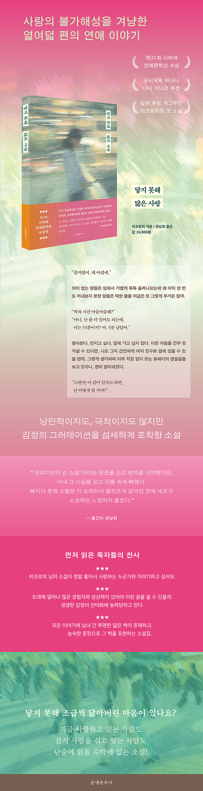 ÀϺ» À¯¸í Äڹ̵ð¾ð È÷ÄÚ·ÎÈ÷ÀÇ Ã¹ ¹øÂ° ¼Ò¼³ÁýÀÌ ¹®¿¹ÃáÃ߻翡¼ Ãâ°£µÇ¾ú´Ù. ¡¶´êÁö ¸øÇØ ´âÀº »ç¶û¡·Àº ¡°¿¬¾Ö¶ó´Â À帣ÀÇ ¼¶ø °°Àº °Ç º°·Î ¾ø´Ù¡±¶ó°í °í¹éÇÑ ÀúÀÚ°¡ ¿¬¾ÖÀÇ Á¤°îÀ» Â´Â À̾߱â´Ù. »ç¶ûÀÇ ºÒ°¡ÇؼºÀ» Á¤È®È÷ °Ü³ÉÇÏ´Â ¿¿©´ü ÆíÀÇ ÀÛǰÀº Á¦31ȸ ½Ã¸¶¼¼ ¿¬¾Ö¹®ÇлóÀ» ¼ö»óÇÏ¸ç Æò´ÜÀÇ ÁÖ¸ñÀ» ¹Þ¾Ò´Ù.