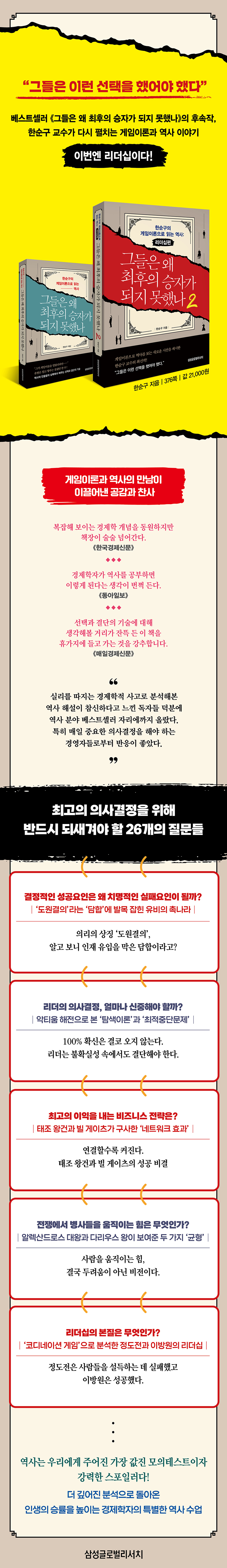 ÀüÀÛÀÌ 13°¡Áö ¿ª»çÀû »ç°ÇÀ» º¹±âÇϸç Àι°µéÀÇ ½ÇÆÐ ¿øÀÎÀ» ¤¾î³Â´Ù¸é, À̹ø Ã¥Àº ±× µÎ ¹è¿¡ ´ÞÇÏ´Â 26°³ÀÇ »ç°ÇÀ» ´Ù·é´Ù. ¹üÀ§´Â ³Ð¾îÁ³Áö¸¸ ±ÛÀº ª°í ¼Óµµ°¨ ÀÐ°Ô Àü°³µÇ¾î ´õ ¸¹Àº À̾߱Ⱑ ´ã°åÀ½¿¡µµ ÆäÀÌÁö°¡ ºü¸£°Ô ³Ñ¾î°£´Ù. ¶Ç ¡°°áÁ¤ÀûÀÎ ¼º°ø¿äÀÎÀº ¿Ö Ä¡¸íÀûÀÎ ½ÇÆÐ¿äÀÎÀÌ µÉ±î?¡±, ¡°¡®À§Çè °¨¼ö¡¯ Ãø¸é¿¡¼ Àü·«ÀÇ °í¼ö´Â ´©±¸Àΰ¡?¡±¿Í °°ÀÌ ¸®´õµéÀÌ ÇѹøÂë °í¹ÎÇØº¸¾ÒÀ» Áú¹®À» °¢ ÀåÀÇ Á¦¸ñÀ¸·Î »ï¾Æ ¡®³»°¡ ±× »óȲ¿¡ ÀÖ¾ú´Ù¸é ¾î¶² ¼±ÅÃÀ» ÇßÀ»±î?¡¯¶ó´Â »ó»óÀ¸·Î µ¶ÀÚ¸¦ À̲ö´Ù. ÀÌ·¯ÇÑ ±¸¼ºÀ» ÅëÇØ ÀúÀÚ´Â ¿ª»ç°¡ °ú°ÅÀÇ ±â·ÏÀÌ ¾Æ´Ï¶ó ¿À´ÃÀ» ºñÃß´Â °Å¿ïÀ̶ó´Â Á¡À» ´õ¿í ¼±¸íÇÏ°Ô µå·¯³½´Ù.