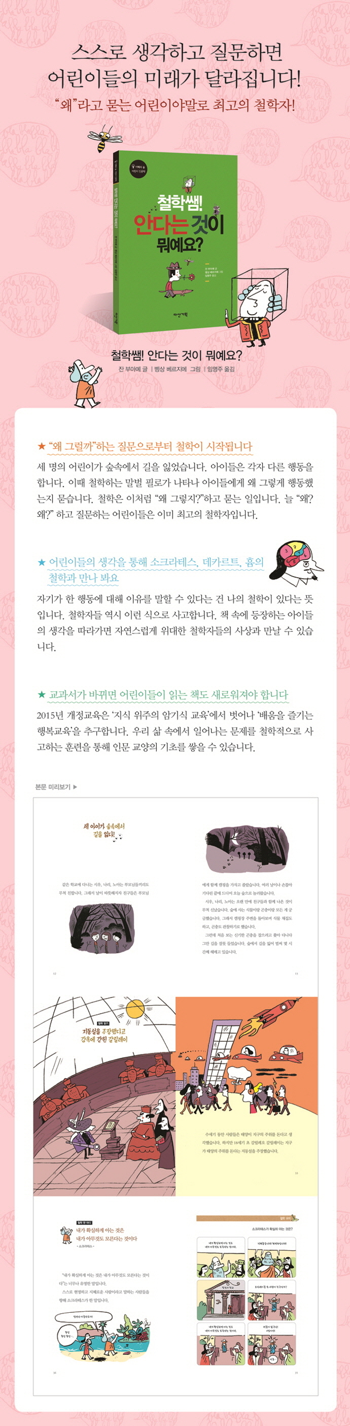 Ã¥¼Ò°³ÁöÇýÀÇ ½£ ¾î¸°ÀÌ Àι®ÇÐ µÎ ¹øÂ° Ã¥ ¡ºÃ¶ÇнÜ! ¾È´Ù´Â °ÍÀÌ ¹¹¿¹¿ä?¡». ¡°¿Ö¡±¶ó°í ¹°À¸¸ç ÂüµÈ °ÍÀ» ¾Ë±â À§ÇØ Áú¹®ÇÏ°í ±íÀÌ »ý°¢ÇÏ´Â °úÁ¤ÀÌ Ã¶ÇÐÀÔ´Ï´Ù. ¾î¸°À̵éÀÌ Ã¥À» Àо¸ç ¼¼ ¸íÀÇ ¾ÆÀ̵éó·³ ¾È´Ù´Â °ÍÀ» ¾î¶»°Ô ¾Æ´ÂÁö¸¦ ½º½º·Î¿¡°Ô Áú¹®ÇØ º¼ ¼ö ÀÖ½À´Ï´Ù. ÀÌ ¹®Á¦¿¡ °üÇØ ºñ½ÁÇÑ °í¹ÎÀ» Çß´ø öÇÐÀÚµéÀÇ »ý°¢°úµµ ¸¸³¯ ¼ö ÀÖ½À´Ï´Ù. ³ª¾Æ°¡ Ã¥ ¼ÓÀÇ Àбâ ÀڷḦ ÅëÇØ Àϻ󿡼 ¸¸³¯ ¼ö ÀÖ´Â ¿©·¯ »çȸÀû ¹®Á¦¿¡ °ü½ÉÀ» °®°í ´õ ±íÀÌ »ý°¢ÇÏ´Â ÈÆ·ÃÀ» Çϸç öÇÐÇÏ´Â ÈûÀ» Ű¿ï ¼ö ÀÖ½À´Ï´Ù.