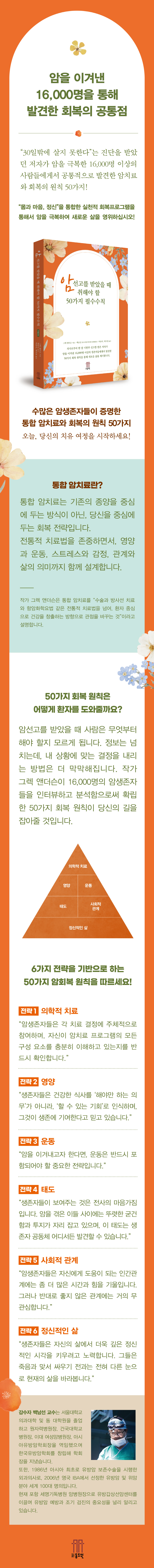 Ã¥¼Ò°³¾Ï¼±°í´Â ´©±¸¿¡°Ô³ª °©ÀÛ½º·´°í, ¸Ó¸´¼ÓÀÌ ÇϾêÁö´Â ¼ø°£ÀÔ´Ï´Ù. ±×·¯³ª ¡º¾Ï¼±°í¸¦ ¹Þ¾ÒÀ» ¶§ ÃëÇØ¾ß ÇÒ 50°¡Áö Çʼö¼öÄ¢¡»Àº ±× ¼ø°£À» Áö³ª ´Ù½Ã »îÀ» ºÙÀâµµ·Ï µ½´Â ½Çõ ¾È³»¼ÀÔ´Ï´Ù. 4±â Æó¾Ï Áø´Ü°ú ÇÔ²² ÇÑ ´Þ¹Û¿¡ ³²Áö ¾Ê¾Ò´Ù´Â ¼±°í¸¦ ¹Þ¾Ò´ø ±×·º ¾Ø´õ½¼Àº, ¡°»ì¾Æ³²Àº »ç¶÷µé¿¡°Ô ±æÀÌ ÀÖ´Ù¡±´Â È®½ÅÀ¸·Î 16,000¸í ÀÌ»óÀÇ ¾Ï»ýÁ¸ÀÚµéÀ» ¸¸³ª ȸº¹ÀÇ °øÅë ¿øÄ¢À» Á¤¸®Çß½À´Ï´Ù. ÀÌ Ã¥Àº ±× ¿øÄ¢À» µ¶ÀÚ°¡ ¹Ù·Î µû¶ó ÇÒ ¼ö ÀÖµµ·Ï ÅëÇÕ ¾ÏÄ¡·á ¹æ½Ä°ú 50°¡Áö ¼öÄ¢À¸·Î ±¸Ã¼ÈÇÑ °á°ú¹°ÀÔ´Ï´Ù.