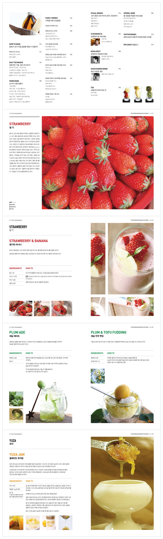 ÀÚ, ±×·³ ÁÖº¯¿¡¼ ½±°Ô ±¸ÇÒ ¼ö ÀÖ´Â ½Å¼±ÇÑ Àç·á¸¦ ÀÌ¿ëÇÏ¿© °£ÆíÇÏ°Ô ¸¸µé ¼ö ÀÖ´Â °Ç° À½·á¿Í ÇÔ²² ¿Â °¡Á·ÀÇ °Ç°°ú ¿ôÀ½À» ì°Üº¸ÀÚ. P.04 ÇÞ»ìÀÌ ºñÄ¡´Â ¾ÆÄ§, ¿À´Ãµû¶ó ÀÌ»óÇÏ°Ô ÀÏÂï ´«ÀÌ ¶°Á³´Ù. ÁÖ¸»À̸é, ¿µÈº¸°í ¹ä ¸Ô°í, ¹ä ¸Ô°í ¿µÈ º¸´Â µ¥ÀÌÆ® ÄÚ½º°¡ ½ÈÁõÀÌ ³ª¼ÀÎÁö ¿À·£¸¸¿¡ »ç¶ûÇÏ´Â ±×³à¸¦ À§ÇØ ½Å¼±ÇÑ Àç·á¸¦ ã¾Æ ³ª¼±´Ù. ¾ó¸¶ Àü À¯·´°ú ¹Ì±¹ ÃâÀå¿¡¼ º» ±¤°æ Áß Àλó ±í¾ú´ø °ÍÀº ¿äÁò ±×µéÀº ³ó»ê¹° Á÷ÆÇÀå[Farmer¡¯s market]¿¡ ¿±¤Çϰí ÀÖ´Ù´Â °ÍÀÌ´Ù. °¢ »êÁö¿¡¼ ±×³¯ »õº®¿¡ ÃâÇÏÇÑ ½Å¼±ÇÑ ½ÄÀç·á¸¦ ÇÑ´«¿¡ ¸¸³ª º¼ ¼ö ÀÖ´Â ½ÃÀå¿¡ ¸»ÀÌ´Ù. ¸¶Æ®ÀÇ Æí¸®ÇÔµµ ÁÁÁö¸¸ À̹ø ÁÖ¸»Àº »ç¶ûÇÏ´Â ³» °¡Á·À» À§ÇØ Á¤ÀÌ ³ÑÄ¡´Â ½ÃÀåÀ¸·Î ±×¿Í ÇÔ²² ¼ÕÀ» Àâ°í À庸±â¿¡ ³ª¼º¸ÀÚ. Àû´çÈ÷ °È´Â ¿îµ¿·®°ú ÂøÇÑ °¡°Ý¿¡ ½Å¼±ÇÑ Àç·á¸¦ ±¸¸ÅÇÑ °Í¿¡ ´ëÇÑ »ÑµíÇÔÀ¸·Î Çູ°¨ÀÌ ¹Ð·Áµé °ÍÀÌ´Ù. P.10 ¼¼°è 10´ë ¼öÆÛǪµåÇÏ¸é ¶°¿À¸£´Â °ÍÀÌ ¹«¾ùÀÌ ÀÖÀ»±î? ¡®ºí·çº£¸®¡¯°¡ °¡Àå Àß ¾Ë·ÁÁ³Áö¸¸ ¿©±â Àß ¾Ë·ÁÁöÁö ¾ÊÀº ¶Ç ÇϳªÀÇ ¼öÆÛǪµå°¡ ÀÖ´Ù. ¹Ù·Î ¸¶´©Ä« Çã´Ï[Manuka Honey]´Ù. ´ºÁú·£µåÀÇ Æ¯»ê¹°·Î ¹úµéÀÌ °úÀÏÁóÀ» ¸Ô°í ²ÜÀ» ¸¸µé¾î³»´Â Ưº°ÇÑ ÅäÂø ½Ä¹°ÀÇ À̸§À» µý °ÍÀÌ´Ù. ¸¶´©Ä«³ª¹«, ¶Ç´Â ´ºÁú·£µå Â÷³ª¹«[Leptospermum scoparium]´Â ÀÛÀº ÀÙÀÌ ´Þ¸®´Â ¹«¼ºÇÑ °ü¸ñÀ¸·Î, ÇϾá»ö¿¡¼ ºÐÈ«»öÀÇ ²ÉÀ» ÇÇ¿î´Ù. ¸¶À½À» ¾ÈÁ¤½ÃŰ´Â È¿°ú°¡ Àִ ƯÀ¯ÀÇ Çâ±â¿¡ ´õÇØ À¯Ä®¸³Åõ½º ÇâÀÌ ¹è¾î ÀÖ¾î ¸¶´©Ä«³ª¹«´Â ³ÃÈÆ¿ëÀ¸·Î Àαâ ÀÖ´Â ÀåÀÛÀÌ´Ù. P.029 ÇöÀç ¼¼°èÀÇ ¸Ô´Â ¹° ½ÃÀåÀº °í±Þ ¹Ì³×¶ö¿öÅÍ ½ÃÀåÀ¸·Î È®»êµÇ°í ÀÖ´Ù. ±â¸§º¸´Ù ´õ ºñ½Ñ ¹°µéÀÌ ÁñºñÇÏ°í »ç¶÷µéÀº À̰Ϳ¡ È£ÀÀÇÑ´Ù. ÀÌó·³ Á¾·ù°¡ ¸¹Àº ºñ½Ñ ¹°µéÀ» ´õ ÀÌ»ó µðÀÚÀθ¸À» º¸°í ¼±ÅÃÇÏÁö ¸»ÀÚ. ¹°Àº ¸À[pH], ´À³¦[°æµµ], ¹«±â¹° ÇÔÀ¯·®[TDS], ǰÁú[û°á]·Î Æò°¡Çϴµ¥ À̰Ϳ¡ Ãë¼öÁö¿Í ¸¶ÄÉÆÃÀÌ ¶Ç ´Ù¸¥ ¿ªÇÒÀ» ÇÑ´Ù. ¶ÇÇÑ ¿©±â¿¡ Ç×»ó ºÙ¿©¾ß ÇÏ´Â Ä®·Î¸®´Â ´ç¿¬È÷ Á¦·ÎÀÌ´Ù. ¸¸¾à ¿öÅ͹Ù[Water bar]¸¦ ²Þ²Ù°í ÀÖ´Ù¸é ´«À» Å©°Ô ¶ß°í ÁýÁßÇÏÀÚ. P.044 ÃâÆÇ»ç ¼Æò´©±¸³ª µû¶óÇÒ ¼ö ÀÖ´Â Ãʰ£Æí ·¹½ÃÇǷΠ÷°¡¹° °ÆÁ¤ ¾ø´Â Ȩ¸ÞÀ̵å À½·á ¸¸µé±â!