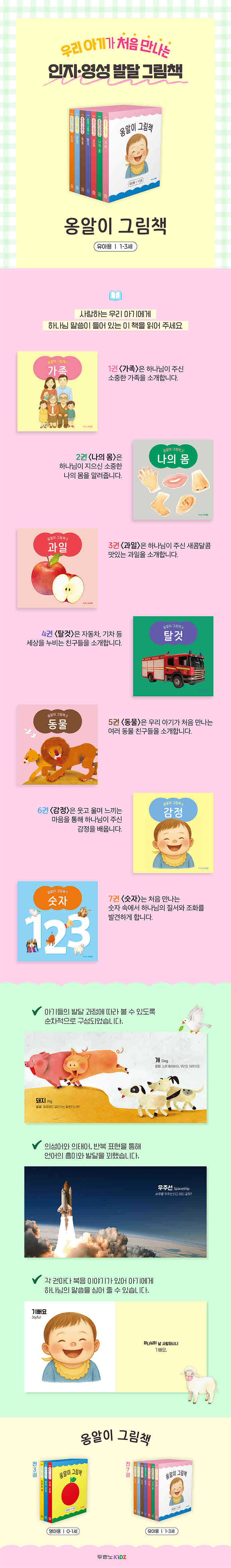 20¿© ³â°£ ²ÙÁØÈ÷ »ç¶û¹ÞÀº ¡¶¿Ë¾ËÀÌ ±×¸²Ã¥¡·(Àü10±Ç)À» »õ·Ó°Ô Àç´ÜÀåÇÏ¿© ¿µ¾Æ¿ë(0-1¼¼, Àü3±Ç), À¯¾Æ¿ë(1-3¼¼, Àü7±Ç)À¸·Î ºÐ±ÇÇÏ¿© Ãâ°£ÇÕ´Ï´Ù. ¾Æ±âµéÀÇ ¹ß´Þ °úÁ¤¿¡ µû¶ó º¼ ¼ö ÀÖµµ·Ï ¼øÂ÷ÀûÀ¸·Î ±¸¼ºµÇ¾ú½À´Ï´Ù. ¿µ¾Æ¿ëÀº 1±Ç ¡´Èæ¹é ÃÊÁ¡¡µ, 2±Ç ¡´Ä÷¯ ÃÊÁ¡¡µ, 3±Ç ¡´ÀÚ¿¬°ú »ö¡µÀ¸·Î ±¸¼ºÇÏ¿´°í, À¯¾Æ¿ëÀº 1±Ç ¡´°¡Á·¡µ, 2±Ç ¡´³ªÀÇ ¸ö¡µ, 3±Ç ¡´°úÀÏ¡µ, 4±Ç ¡´Å»°Í¡µ, 5±Ç ¡´µ¿¹°¡µ, 6±Ç ¡´°¨Á¤¡µ, 7±Ç ¡´¼ýÀÚ¡µ·Î ±¸¼ºÇÏ¿´½À´Ï´Ù.