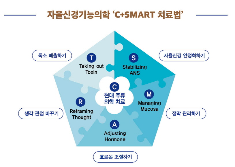 ±¸Á¶¡¤¿µ¾ç¡¤½É¸® ¼¼ ºÐ¾ß¸¦ ±âÃÊ·Î °³¹ßµÈ ÀÚÀ²½Å°æ±â´ÉÀÇÇÐÀº °¢°¢ÀÇ ¿µ¿ª¿¡¼ Áúº´ÀÇ ¿øÀÎ ±Ô¸í°ú Ä¡·á¸¦ À§ÇØ »õ·Î¿î ü°èÀÎ ¡®SMART¡¯ ±â¹ýÀ» µµÀÔÇß´Ù. ±×¸®°í SMART ü°èÀÇ Áß½ÉÀÎ ÀÚÀ²½Å°æ±â´ÉÀÇÇп¡ Çö´ë ÀÇÇÐÀ» Á¢¸ñ½ÃÄÑ ¡®C+SMART Ä¡·á¹ý¡¯À¸·Î ¹ßÀü½ÃÄ×´Ù. ¡®C+SMART Ä¡·á¹ý¡¯Àº Áúº´ÀÇ ¿øÀÎÀ» Çö¸íÇÏ°Ô Ã£¾Æ³»°í, Ä¡·á¸¦ ¶È¶ÈÇÏ°Ô ÇÏÀÚ´Â Àǹ̵µ Æ÷ÇԵǾî ÀÖ´Ù.
