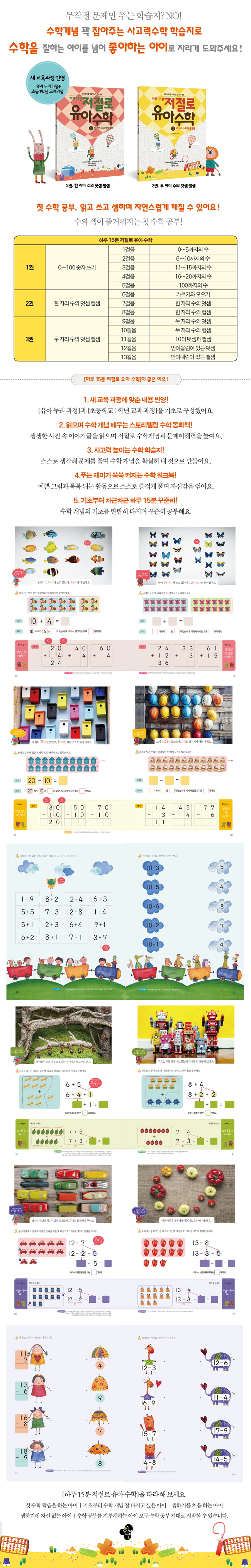 À¯¾Æ¼öÇÐÀ» ½ÃÀÛÇÏ´Â 5¼¼ ¼öÇÐ, 6¼¼ ¼öÇÐ, 7¼¼ ¼öÇÐ °øºÎ¿¡ ÁÁÀº »ç°í·Â¼öÇÐ ÇнÀÁöÀÌ´Ù. »õ ±³À°°úÁ¤(À¯¾Æ ´©¸®°úÁ¤+Ãʵî 1Çг⠱³°ú°úÁ¤)À» ü°èÀûÀ¸·Î ¹Ý¿µÇÑ À¯¾Æ ¼öÇÐ ÇнÀÁö·Î, ´Ü¼ø °è»ê·Â¸¸ Ű¿ì´Â °ÍÀÌ ¾Æ´Ï¶ó À¯¾Æ¼öÇÐÀÇ ±âÃÊ °³³äºÎÅÍ »ç°í·Â¼öÇÐÀÇ ½ÉÈ ¹®Á¦ Ç®À̱îÁö ÇÏ¸é¼ µÎ ÀÚ¸® ¼öÀÇ µ¡¼À°ú »¬¼ÀÀ» ÀÚ¿¬½º·´°Ô ±úÄ¡°Ô ÇØÁØ´Ù. °¡Àå Å« Ư¡Àº ¼öÇÐ µ¿Èó·³ À̾߱⠱ÛÀ» Àаí, ¾²¸é¼ ¼öÇÐ °³³äÀ» È®½ÇÈ÷ ³» °ÍÀ¸·Î ¸¸µé°í, ¼ÀÇϱ⸦ ´õ ¹è¿ì¸é¼ À¯¾Æ ¼öÇÐ °øºÎ¸¦ ¿Ï¼ºÇÒ ¼ö ÀÖ´Ù´Â Á¡ÀÌ´Ù.