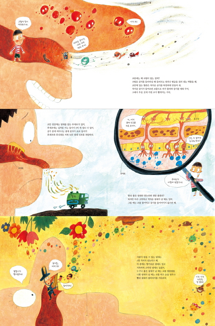 ±×·¡, ¸Â¾Æ. ³¿»õ¸¦ ¸ÃÁö ¸øÇÏ¸é ¸ÀÀ» Àß ´À³¥ ¼ö°¡ ¾ø¾î. ±×·¡¼ ÄÚ°¡ ¸·È÷¸é ¸ÀÀ» Á¦´ë·Î ´À³¥ ¼ö ¾ø´Â °Å¾ß! - 9p ¿ì¸®´Â ÄÚ·Î ³¿»õ¸¦ ¸Ã¾Æ. ÄÚ´Â ¾ÆÁÖ ¿¹¹ÎÇØ¼ °ø±â Áß¿¡ ¶°µµ´Â ³¿»õµéÀ» ±Ý¹æ ¾Ë¾ÆÂ÷¸®Áö. 300¾ï °³ÀÇ °ø±â ºÐÀÚ ¼Ó¿¡ ³¿»õ ºÐÀÚ°¡ ÇÑ °³¸¸ À־ ³¿»õ¸¦ ¸ÃÀ» ¼ö ÀÖ¾î. - 11p °¨±â¿¡ °É¸®¸é Ä๰ÀÌ ³ª°í ÄÚ°¡ ¸·Çô¼ ³¿»õ¸¦ ¸ÃÁö ¸øÇØ. ±×·±µ¥ °¨±â°¡ ´Ù ³ª¾Æµµ ³¿»õ¸¦ ¸ÃÁö ¸øÇÒ ¶§°¡ ÀÖ¾î. °¨±â ¹ÙÀÌ·¯½º°¡ ÈO÷¿¡ ¿°ÁõÀ» ÀÏÀ¸ÄÑ ³¿»õ ¸Ã´Â ±â´ÉÀ» ¶³¾î¶ß·È±â ¶§¹®À̾ß. - 17p ³¿»õ¸¦ ¸Ã´Â ÄÚ´Â ±Ý¹æ ÇǷθ¦ ´À²¸. ¸öÀÌ ÇǰïÇϸé ÀÏÀ» ÇÒ ¼ö ¾ø´Â °Íó·³ ÄÚµµ ¸¶Âù°¡Áö¾ß. ±×·¡¼ °í¾àÇÑ ³¿»õ°¡ ³ª´Â °÷¿¡ À־ Á¶±Ý¸¸ Áö³ª¸é ±× ³¿»õ¸¦ ´À³¢Áö ¸øÇÏ°Ô µÇÁö. - 23p ÃâÆÇ»ç ¼Æò¿ì¸® ¸ö¿¡ ´ëÇÑ ¸ðµç °úÇÐÀû Áö½ÄÀ»