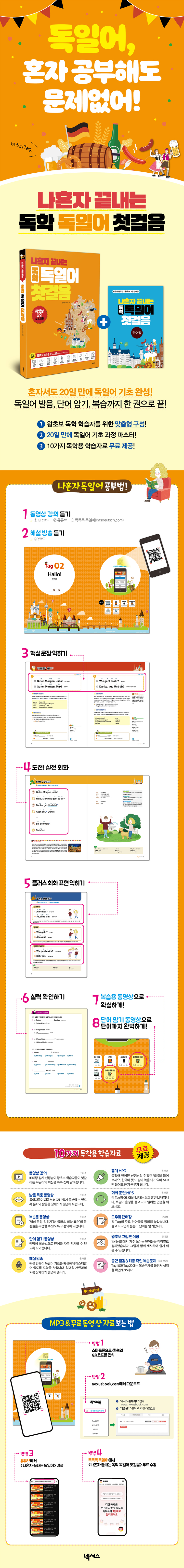 ¡´³ªÈ¥ÀÚ ³¡³»´Â µ¶ÇÐ µ¶ÀϾî ù°ÉÀ½¡µÀº È¥ÀÚ¼ µ¶ÀϾ °øºÎÇÏ´Â ºÐµéÀ» À§ÇØ °³¹ßµÈ µ¶ÇÐÀÚ ¸ÂÃãÇü ±³ÀçÀÔ´Ï´Ù. Çпø¿¡ ´Ù´ÏÁö ¾Ê¾Æµµ, ´Ü¾îÀåÀ̳ª ´Ù¸¥ Âü°í¼¸¦ »çÁö ¾Ê¾Æµµ ÀÌ Ã¥ ÇÑ ±Ç¸¸À¸·Î 20ÀÏ ¸¸¿¡ µ¶ÀÏ¾î ±âÃÊ °úÁ¤À» ¸¶½ºÅÍÇÒ ¼ö ÀÖµµ·Ï ±¸¼ºµÇ¾î ÀÖ½À´Ï´Ù. ¡´³ªÈ¥ÀÚ ³¡³»´Â µ¶ÇÐ µ¶ÀϾî ù°ÉÀ½¡µÀº ºÎ·ÏÀ¸·Î ´Ü¾îÀå(µµ¿ì¹Ì ´Ü¾îÀå+¿ÕÃʺ¸ ±×¸² ´Ü¾îÀå)ÀÌ Æ÷ÇԵǸç, È¥ÀÚ °øºÎÇÏ´Â ÇнÀÀÚµéÀ» À§ÇØ MP3, µ¿¿µ»ó °ÀÇ, ÀúÀÚ Á÷° ÇØ¼³ ¹æ¼Û, ´Ü¾î¾Ï±â µ¿¿µ»ó µî ÃÑ 10°¡Áö µ¶Çпë ÇнÀÀڷḦ ¹«·á·Î Á¦°øÇϰí ÀÖ½À´Ï´Ù.