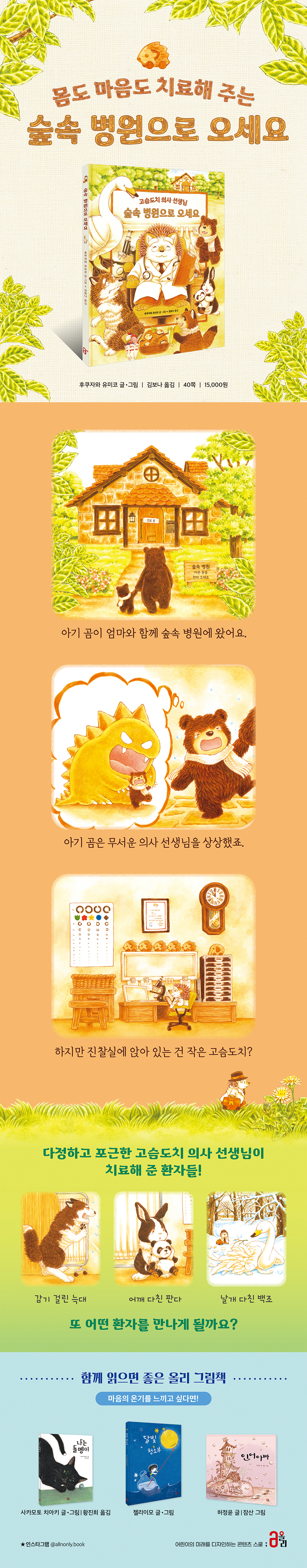 °í½¿µµÄ¡ ÀÇ»ç´Â ¸öµµ ¸¶À½µµ °íÃÄ ÁÖ´Â ¸¸´É ÇØ°á»ç °°Áö¸¸ »ç½Ç ¾àÁ¡ÀÌ ÀÖ¾ú½À´Ï´Ù. ¹Ù·Î ³ôÀº °÷À» ¹«¼¿öÇÑ´Ù´Â °ÍÀÔ´Ï´Ù. ¹è°¡ ¾ÆÆÄ ¿òÁ÷ÀÌÁö ¸øÇÏ´Â ³Ê±¸¸®¸¦ À§ÇØ Á÷Á¢ ÁýÀ¸·Î ã¾Æ°¡ Ä¡·áÇØ ÁÖ°í µ¹¾Æ¿À´Â ±æ, °í½¿µµÄ¡ ÀÇ»ç´Â ³ôÀº ´Ù¸®¸¦ °Ç³Ê¸ç °ÌÀÌ ³ª¼ ¾ûµ¢À̸¦ »©°í ¾û°ÅÁÖÃ㠰ȽÀ´Ï´Ù. ±×·¯´Ù °á±¹ ¼¼Âù ¹Ù¶÷¿¡ ³¯¾Æ°¡ ¹ö¸®ÁÒ. ±×¶§ °í½¿µµÄ¡ Àǻ縦 ±¸ÇØ ÁÖ´Â °Ç ȯÀÚ¿´´ø ¹éÁ¶¿´½À´Ï´Ù. ÀÇ»ç´Â ȯÀÚ¸¦ Ä¡·áÇϰí, ȯÀÚ´Â Àǻ縦 ±¸Çϰí, ¼·Î¸¦ µµ¿ì¸ç º¸¿ÏÇØ ÁÖ´Â ½£¼Ó º´¿ø µ¿¹°µéÀÇ °ü°è´Â ¾Æ¸§´Ù¿î ¿¬´ë¿Í ¿ìÁ¤À» º¸¿© ÁÝ´Ï´Ù. Ã¥ÀÇ ¸¶Áö¸· ÀåÀÎ ¸éÁö¿¡¼µµ °í½¿µµÄ¡ ÀÇ»ç¿Í ¹éÁ¶´Â ȯ»óÀÇ ÄÞºñ´Ù¿î ¸ð½ÀÀ» º¼ ¼ö ÀÖ½À´Ï´Ù. ¾ÆÀ̵éÀº ¡¶½£¼Ó º´¿øÀ¸·Î ¿À¼¼¿ä¡·¸¦ ÅëÇØ ´©±¸³ª µµ¿òÀ» ÁÙ ¼öµµ ¹ÞÀ» ¼öµµ ÀÖ´Ù´Â »ç½ÇÀ» ¹è¿ì¸ç, °ü°è¿Í °øÁ¸ÀÇ °¡Ä¡¸¦ ±ú´Ý°Ô µÉ °ÍÀÔ´Ï´Ù.