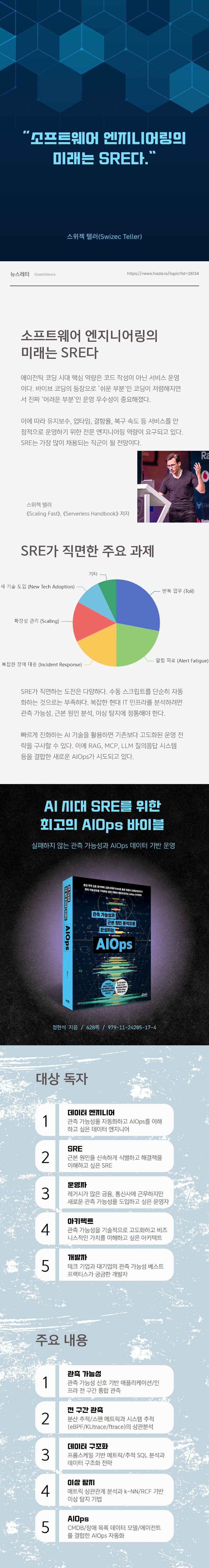ÀÌ Ã¥Àº ÀÌ·¯ÇÑ ½Ã´ëÀû ¿ä±¸¿¡ ºÎÀÀÇÏ´Â, AI ½Ã´ëÀÇ SRE¸¦ À§ÇÑ ¹ÙÀÌºí °°Àº Ã¥ÀÌ´Ù. °üÃø °¡´É¼º¿¡¼ AIOps±îÁöÀÇ ±ä È帧À» µû¶ó°¡¸ç, ½Ã½ºÅÛ Àå¾Ö¸¦ ¾î¶»°Ô ÀÌÇØÇÏ°í ¼³¸íÇÒ ¼ö ÀÖ´ÂÁö »ó¼¼ÇÏ°Ô Ç®¾î³½´Ù. ·Î±×³ª ¸ÞÆ®¸¯À» ³ª¿ÇÏ´Â µ¥ ±×Ä¡Áö ¾Ê°í, °üÃø °¡´É¼º µ¥ÀÌÅͰ¡ ½ÇÁ¦·Î ±Ùº» ¿øÀÎ ºÐ¼®¿¡ ¾î¶»°Ô »ç¿ëµÇ´ÂÁö¿¡ ÃÊÁ¡À» ¸ÂÃá Á¡ÀÌ ÀλóÀûÀÌ´Ù.