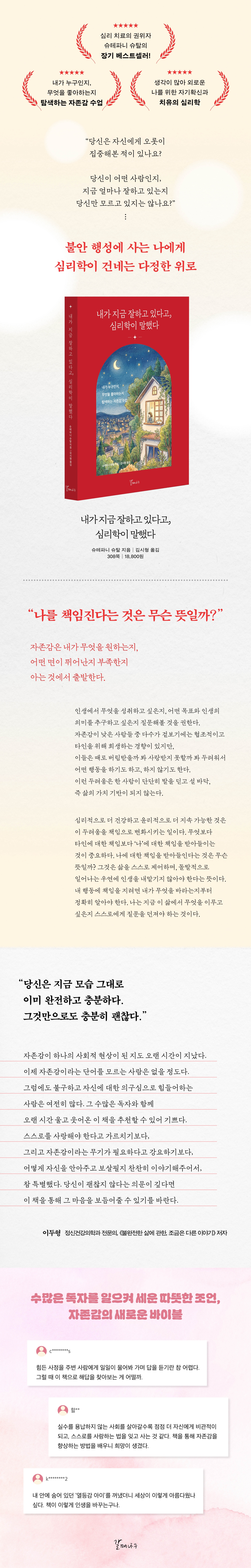 ÀÌ¿Í ÇÔ²² ÀúÀÚ´Â ÀÚÁ¸°¨ °áÇÌÀ» ºÒ·¯¿À´Â ¸ðµç °úÁ¤À» ½É¸®ÇÐÀû ±â¹ÝÀ» µé¾î ±¸Ã¼ÀûÀ¸·Î ÆÄ°íµé¾î °£´Ù. ¾î¸° ½ÃÀý ºÎ¸ð¿ÍÀÇ °ü°è, ¾çÀ° ȯ°æÀÌ ÀÚÁ¸°¨ Çü¼º¿¡ ¹ÌÄ£ ½É¸®Àû ¿µÇâÀ» ½ÃÀÛÀ¸·Î ³»¸éÀÇ ¡®ÀÚ±âºÒ¾È¡¯°ú À¯³â±âÀÇ °æÇèÀÌ ¹Ý¿µµÈ ÀÚ¾Æ ÇüÅÂÀÎ ¡®³»¸é¾ÆÀÌ¡¯, ÀÚ½ÅÀÇ ¿µÇâ·Â¿¡ ´ëÇÑ ¹ÏÀ½À» °¡¸®Å°´Â ¡®³»Àû ÅëÁ¦½Å³ä¡¯, ÀÚ±âºñÇÏ °úÀ׿¡¼ ºñ·ÔµÈ ¡®³ª¸£½Ã½ÃÁò¡¯±îÁö ¿ì¸® ¸¶À½ÀÇ ¹®Á¦¿Í °ü·ÃµÈ °³³äµéÀ» Â÷ºÐÈ÷ Á¤¸®Çسª°£´Ù. ÀÌ ¸ðµç ºÐ¼®°ú ÀÌÇØÀÇ ³¡¿¡´Â ´ÜÁ¡°ú ¾àÁ¡À» ºñ·ÔÇØ ÀÚ½ÅÀ» ÀÖ´Â ±×´ë·Î ¹Þ¾ÆµéÀÌ´Â ¡®ÀÚ±â¼ö¿ë¡¯À̶ó´Â ¸ñÇ¥°¡ ÀÖ´Ù.