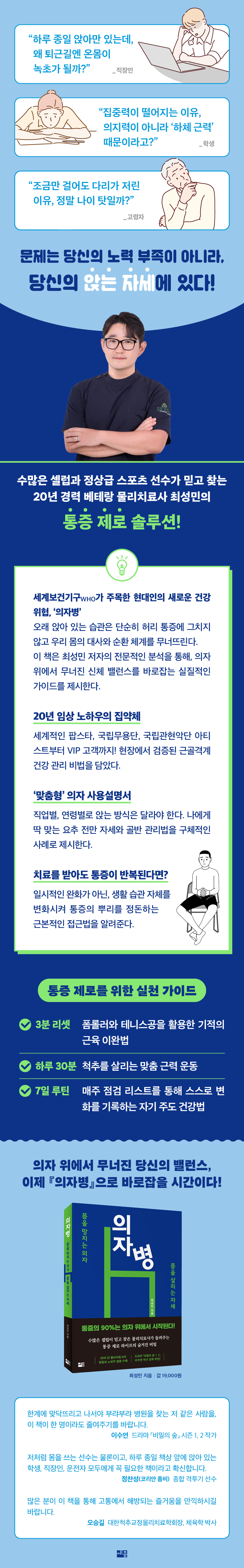 ÀúÀÚ ÃÖ¼º¹ÎÀº 20¿© ³â°£ 4¸¸ °Ç ÀÌ»óÀÇ ÀÓ»ó °æÇèÀ» ÅëÇØ, °Ë»ç»ó ÀÌ»óÀÌ ¾ø¾îµµ ÅëÁõÀ» È£¼ÒÇϴ ȯÀڵ鿡°Ô¼ °øÅëµÈ ÆÐÅÏÀ» ¹ß°ßÇß´Ù. ƯÁ¤ ±ÙÀ°Àº °úµµÇÏ°Ô ±äÀåµÇ°í, ½á¾ß ÇÒ ±ÙÀ°Àº ºñȰ¼ºÈµÈ »óÅ¿´À¸¸ç, ±× Ãâ¹ßÁ¡¿¡´Â ´Ã ¡®ÀÇÀÚ À§ÀÇ ÀÚ¼¼¡¯°¡ ÀÖ¾ú´Ù. ÀúÀÚ´Â ÀÌ Çö»óÀ» ¡®ÀÇÀÚº´¡¯À̶ó ¸í¸íÇÑ´Ù. ÀÇÀÚº´À̶õ À߸øµÈ ¾É±â ½À°üÀ¸·Î ÀÎÇØ ¹ß»ýÇÏ´Â Àü½Å ÅëÁõ°ú ±â´É ÀúÇϸ¦ ÅëĪÇÏ´Â ¸»ÀÌ´Ù. ÀúÀÚ´Â Àå½Ã°£ ÁÂ½Ä »ýȰ°ú À߸øµÈ ¾É±â ½À°üÀÌ Àü½Å ÅëÁõ°ú ±â´É ÀúÇÏ·Î À̾îÁö´Â °úÁ¤À» ½ÇÁ¦ »ç·Ê¿Í ÇÔ²² ¼³¸íÇÑ´Ù.