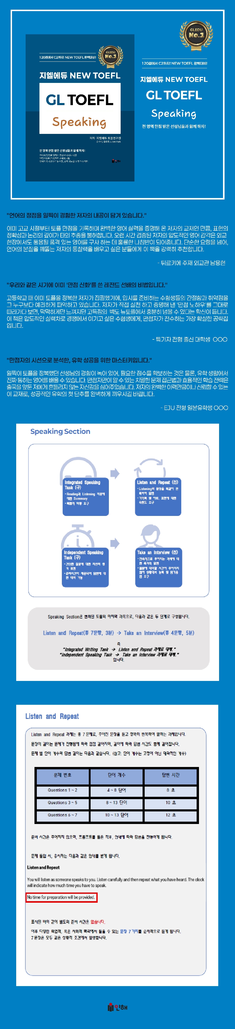 GL TOEFL SpeakingÀº ÀÌ·¯ÇÑ º¯ÈµÈ Modernized TOEFLÀÇ ÃֽŠÃâÁ¦ °æÇâ°ú Æò°¡ ¹æ½ÄÀ» Ãæ½ÇÈ÷ ¹Ý¿µÇß½À´Ï´Ù. »õ·Î¿î ½Ã´ëÀÇ ¿µ¾î ´É·ÂÀ», »õ·Î¿î ¹æ½ÄÀ¸·Î ÁغñÇϼ¼¿ä.