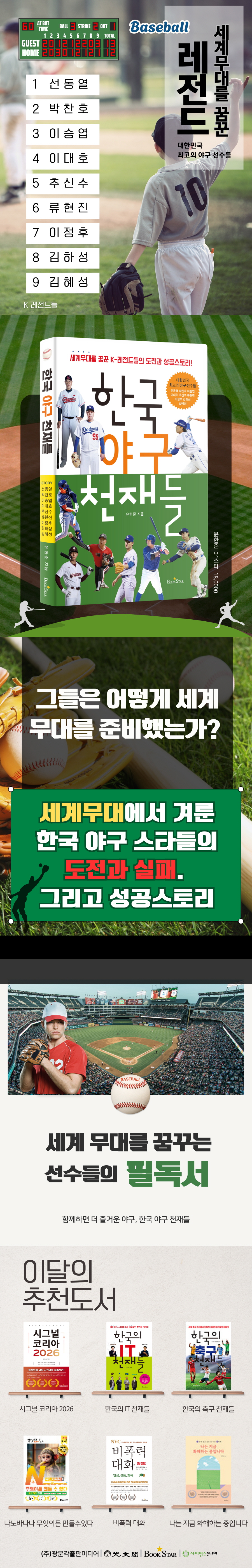 ÀÌ Ã¥Àº Çѱ¹ ÇÁ·Î¾ß±¸ ¼±¼öµé °¡¿îµ¥ ±¹³» ¸®±×¿Í ¹Ì±¹¤ýÀϺ» µî ±¹Á¦¹«´ë¿¡¼ Ȱ¾àÇÏ¸é¼ ÄÚ¸®¾ÆÀÇ ¸í¿¹¸¦ µå³ôÀÌ°í ºÒ¸êÀÇ ¼ºÀûÀ» ³²±â°í ÀºÅðÇÑ ½ºÅ¸¿Í ÇöÀç Ȱµ¿ÇÏ´Â ¼±¼öµé °¡¿îµ¥ Ưº°ÇÑ ¼ºÀûÀ» ½×°í ÀÖ´Â ¼±¼öµé Áß¿¡¼ ƯÈ÷ ¾ß±¸ÆÒµéÀÇ »ç¶ûÀ» ¹Þ´Â ¼±µ¿¿, ¹ÚÂùÈ£, À̽¿±, ÀÌ´ëÈ£, Ã߽żö, ·ùÇöÁø, ÀÌÁ¤ÈÄ, ±èÇϼº, ±èÇý¼º ¼±¼öÀÇ ¾ß±¸ ±â·Ï°ú ÀÏȸ¦ Áß½ÉÀ¸·Î °£Ãß·Á, ¾ß±¸ ²Þ³ª¹«µé¿¡°Ô ½ºÅ¸µéÀÌ ½ñ¾Æ³½ µÎ³ú Ç÷¹ÀÌ¿Í Áø±â·ÏµéÀ» ¸ð¾Æ ¾Ë±â ½±°í Àç¹ÌÀÖ´Â ½ºÅ丮 Áß½ÉÀ¸·Î ¿«¾ú½À´Ï´Ù.